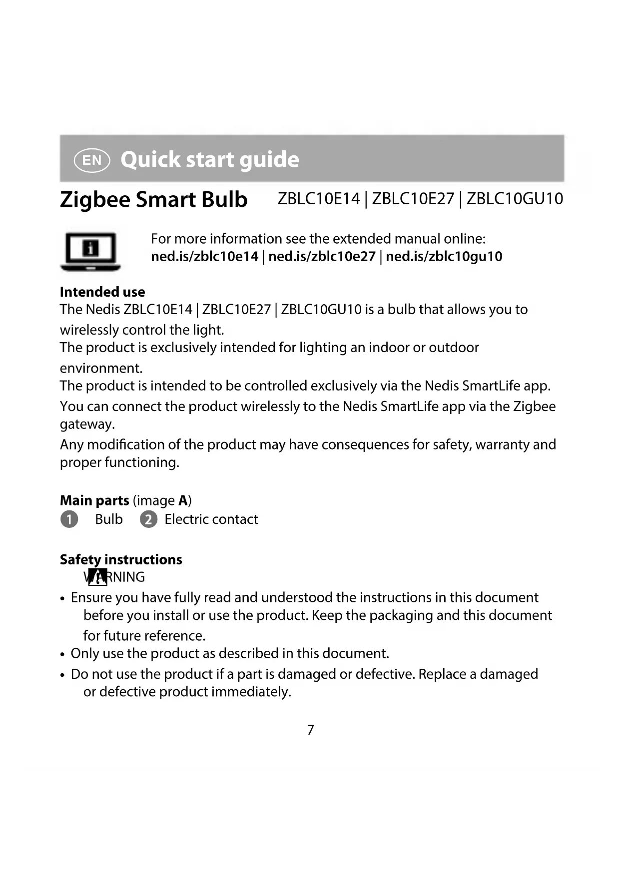 For more information see the extended manual online: ned.is/zblc10e14 | ned.is/zblc10e27 | ned.is/zblc10gu10 Intended use The Nedis ZBLC10E14 | ZBLC10E27 | ZBLC10GU10 is a bulb that allows you to wirelessly control the light. The product is exclusively intended for lighting an indoor or outdoor environment. The product is intended to be controlled exclusively via the Nedis SmartLife app. You can connect the product wirelessly to the Nedis SmartLife app via the Zigbee gateway. Any modication of the product may have consequences for safety, warranty and proper functioning. Main parts (image A) 1 Bulb 2 Electric contact Safety instructions