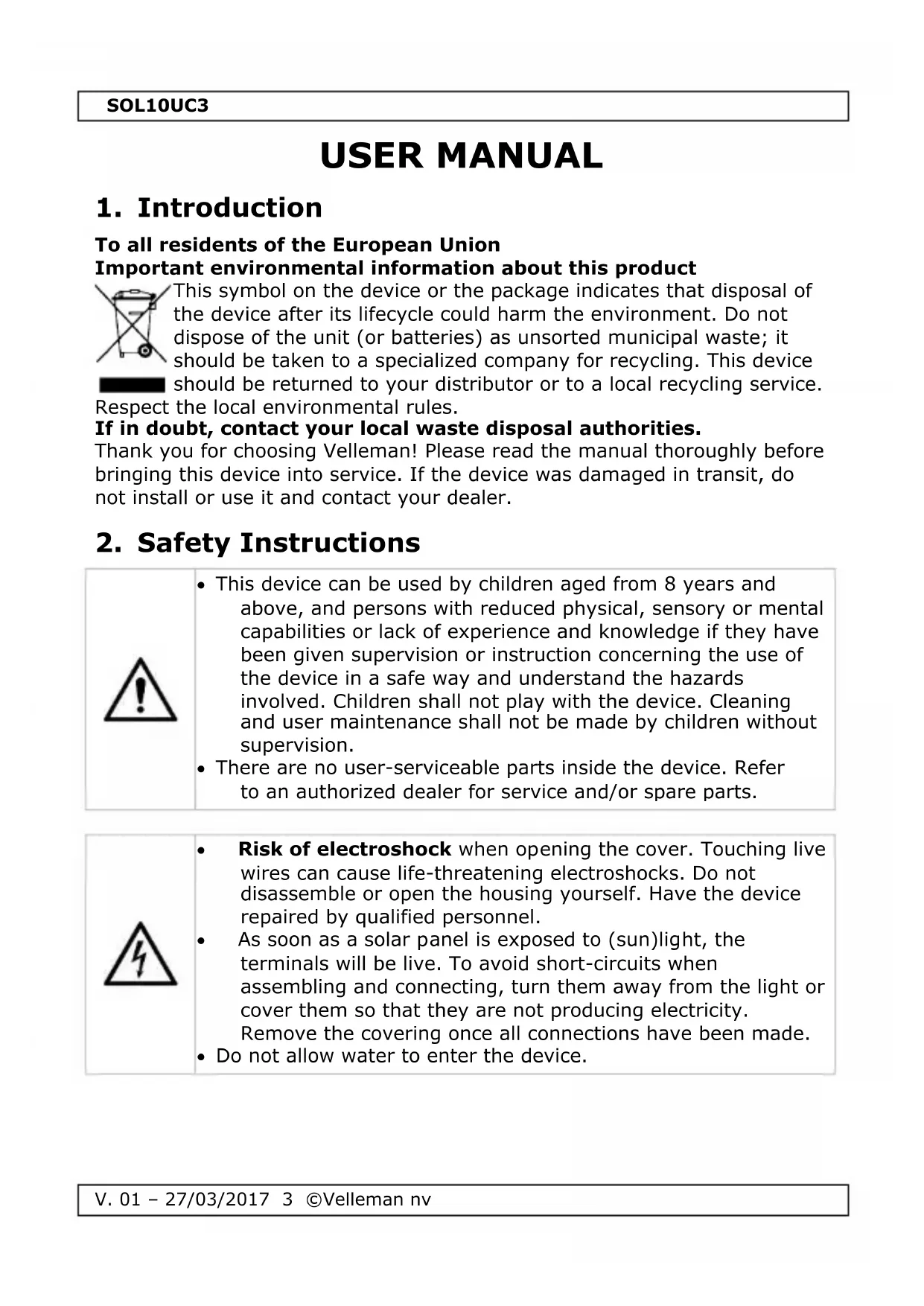 Service and Quality Warranty on the last pages of this manual. Familiarise yourself with the functions of the device before actually using it. All modifications of the device are forbidden for safety reasons. Damage caused by user modifications to the device is not covered by the warranty. Only use the device for its intended purpose. All other uses may lead to short circuits, burns, electroshocks, crash, etc. Using the device in an unauthorized way will void the warranty. Damage caused by disregard of certain guidelines in this manual is not covered by the warranty and the dealer will not accept responsibility for any ensuing defects or problems. Nor Velleman nv nor its dealers can be held responsible for any damage (extraordinary, incidental or indirect) – of any nature (financial, physical…) arising from the possession, use or failure of this product. Keep this manual for future reference.SOL10UC3