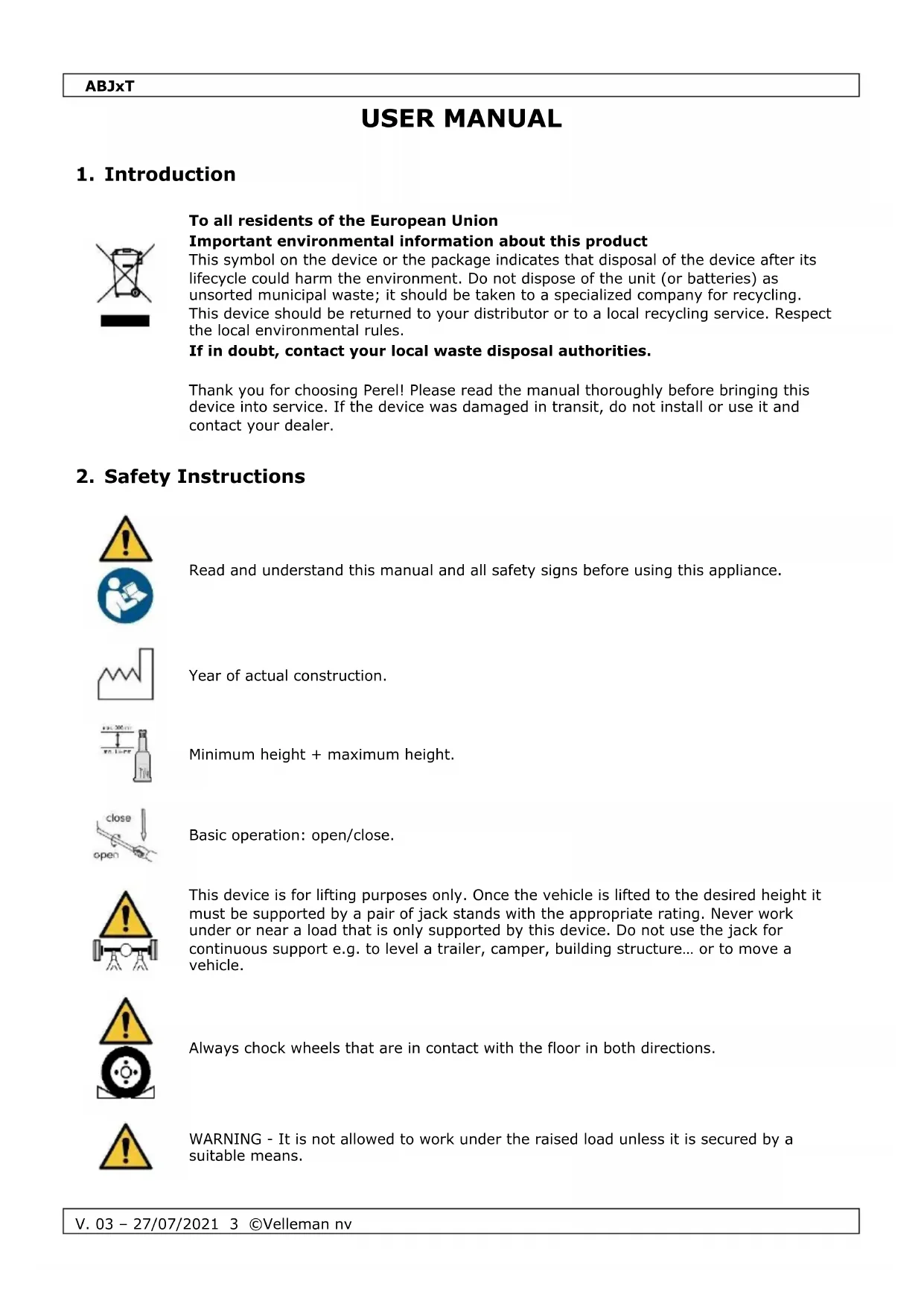 Download the instructions for your Jack in PDF format for free! Find your manual ABJ2T - Perel and take your electronic device back in hand. On this page are published all the documents necessary for the use of your device. ABJ2T by Perel.