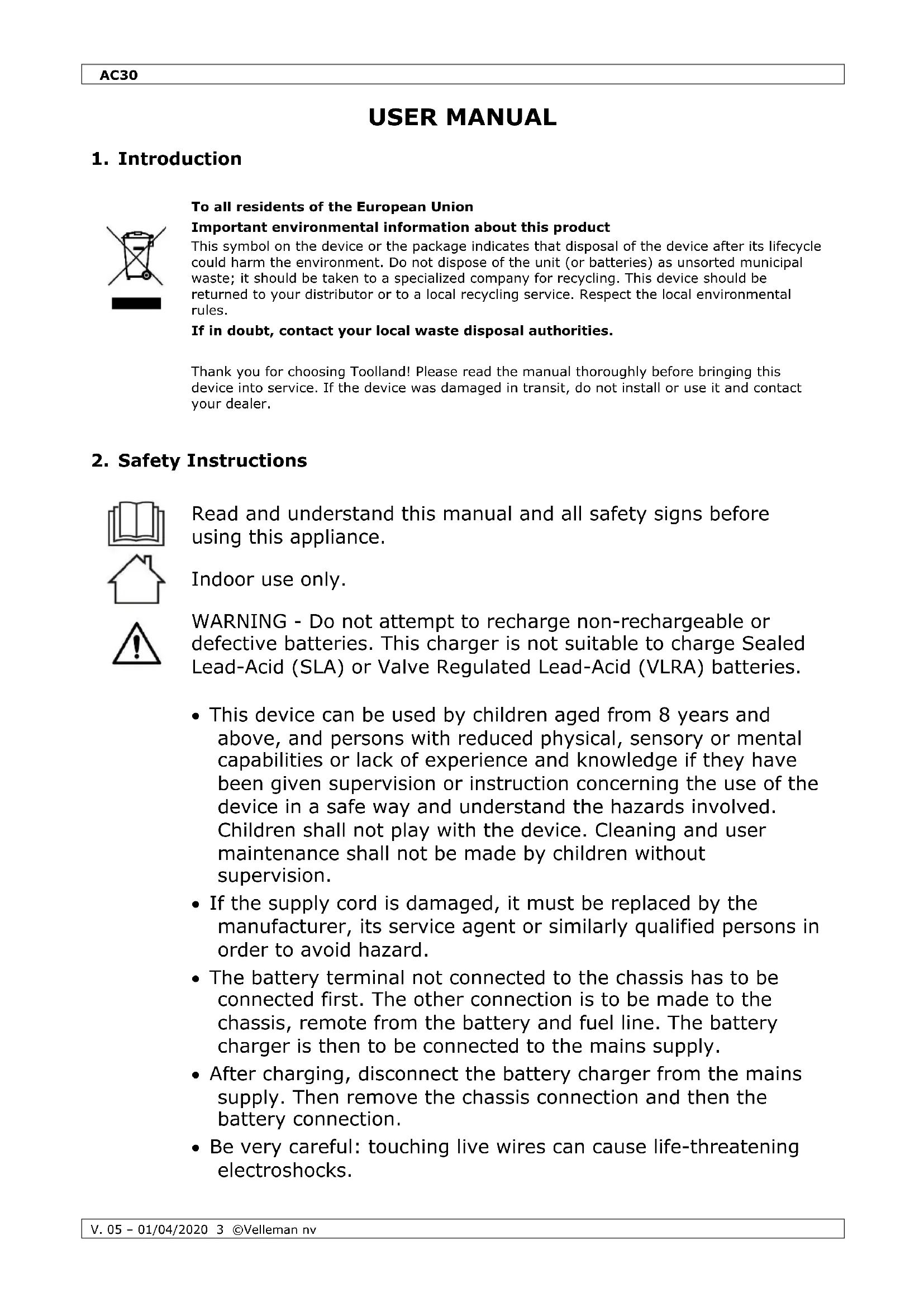 Download the instructions for your Battery charger in PDF format for free! Find your manual AC30 - Toolland and take your electronic device back in hand. On this page are published all the documents necessary for the use of your device. AC30 by Toolland.