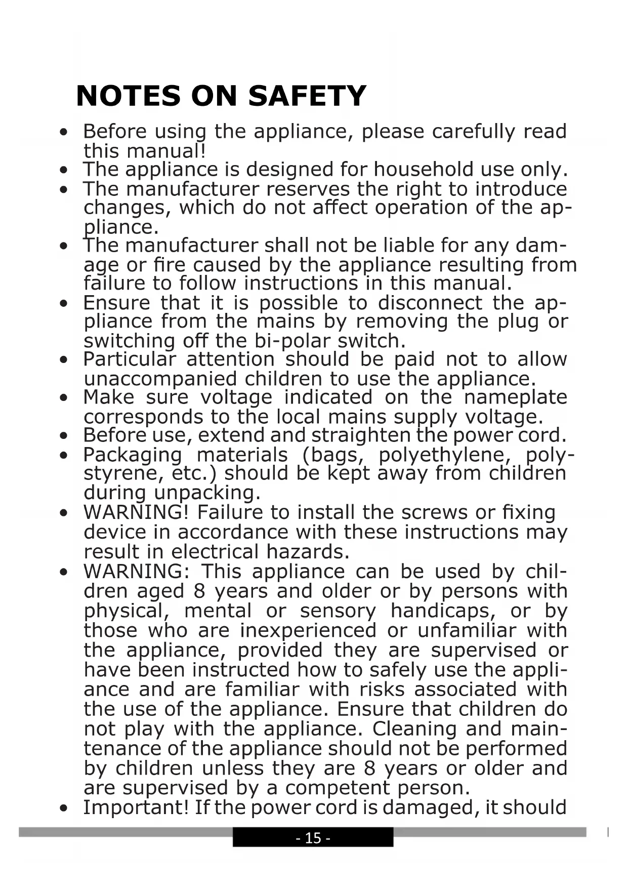 - The manufacturer shall not be liable for any dam- age or re caused by the appliance resulting from failure to follow instructions in this manual.