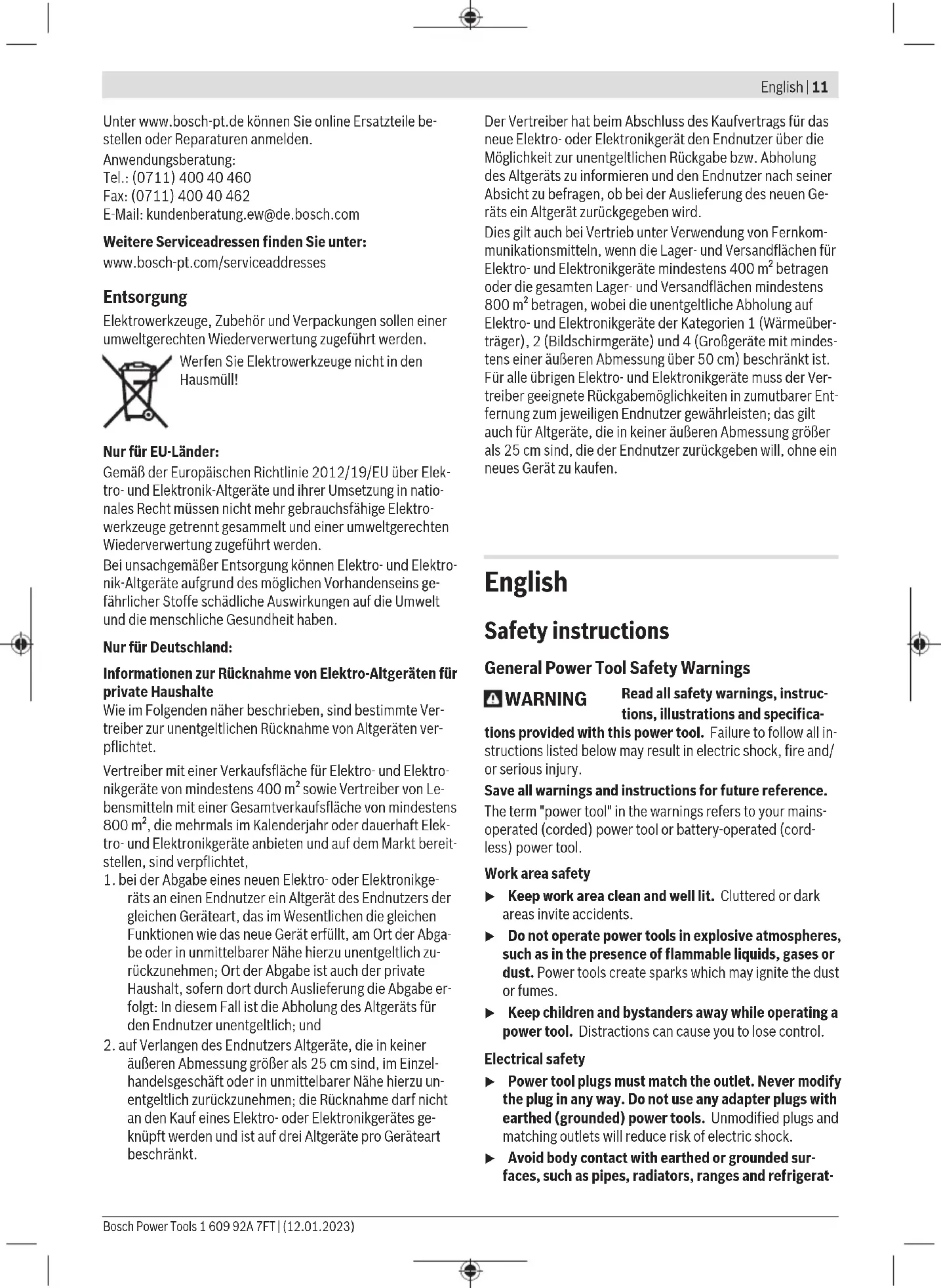 äußeren Abmessung größer als 25cm sind, im Einzel- handelsgeschäft oder in unmittelbarer Nähe hierzu un- entgeltlich zurückzunehmen; die Rücknahme darf nicht an den Kauf eines Elektro- oder Elektronikgerätes ge- knüpft werden und ist auf drei Altgeräte pro Geräteart beschränkt. Der Vertreiber hat beim Abschluss des Kaufvertrags für das neue Elektro- oder Elektronikgerät den Endnutzer über die Möglichkeit zur unentgeltlichen Rückgabe bzw. Abholung des Altgeräts zu informieren und den Endnutzer nach seiner Absicht zu befragen, ob bei der Auslieferung des neuen Ge- räts ein Altgerät zurückgegeben wird. Dies gilt auch bei Vertrieb unter Verwendung von Fernkom- munikationsmitteln, wenn die Lager- und Versandflächen für Elektro- und Elektronikgeräte mindestens 400m² betragen oder die gesamten Lager- und Versandflächen mindestens 800m² betragen, wobei die unentgeltliche Abholung auf Elektro- und Elektronikgeräte der Kategorien 1 (Wärmeüber- träger), 2 (Bildschirmgeräte) und 4 (Großgeräte mit mindes- tens einer äußeren Abmessung über 50cm) beschränkt ist. Für alle übrigen Elektro- und Elektronikgeräte muss der Ver- treiber geeignete Rückgabemöglichkeiten in zumutbarer Ent- fernung zum jeweiligen Endnutzer gewährleisten; das gilt auch für Altgeräte, die in keiner äußeren Abmessung größer als 25cm sind, die der Endnutzer zurückgeben will, ohne ein neues Gerät zu kaufen. English Safety instructions General Power Tool Safety Warnings WARNING Read all safety warnings, instruc- tions, illustrations and specifica- tions provided with this power tool. Failure to follow all in- structions listed below may result in electric shock, fire and/ or serious injury. Save all warnings and instructions for future reference. The term "power tool" in the warnings refers to your mains- operated (corded) power tool or battery-operated (cord- less) power tool. Work area safety u Keep work area clean and well lit. Cluttered or dark areas invite accidents. u Do not operate power tools in explosive atmospheres, such as in the presence of flammable liquids, gases or dust. Power tools create sparks which may ignite the dust or fumes. u Keep children and bystanders away while operating a power tool. Distractions can cause you to lose control. Electrical safety u Power tool plugs must match the outlet. Never modify the plug in any way. Do not use any adapter plugs with earthed (grounded) power tools. Unmodified plugs and matching outlets will reduce risk of electric shock. u Avoid body contact with earthed or grounded sur- faces, such as pipes, radiators, ranges and refrigerat- Bosch Power Tools 1 609 92A 7FT | (12.01.2023)12 | English ors. There is an increased risk of electric shock if your body is earthed or grounded. u Do not expose power tools to rain or wet conditions. Water entering a power tool will increase the risk of elec- tric shock. u Do not abuse the cord. Never use the cord for carry- ing, pulling or unplugging the power tool. Keep cord away from heat, oil, sharp edges or moving parts. Damaged or entangled cords increase the risk of electric shock. u When operating a power tool outdoors, use an exten- sion cord suitable for outdoor use. Use of a cord suit- able for outdoor use reduces the risk of electric shock. u If operating a power tool in a damp location is un- avoidable, use a residual current device (RCD) protec- ted supply. Use of an RCD reduces the risk of electric shock. Personal safety u Stay alert, watch what you are doing and use common sense when operating a power tool. Do not use a power tool while you are tired or under the influence of drugs, alcohol or medication. A moment of inatten- tion while operating power tools may result in serious per- sonal injury. u Use personal protective equipment. Always wear eye protection. Protective equipment such as a dust mask, non-skid safety shoes, hard hat or hearing protection used for appropriate conditions will reduce personal in- juries. u Prevent unintentional starting. Ensure the switch is in the off-position before connecting to power source and/or battery pack, picking up or carrying the tool. Carrying power tools with your finger on the switch or en- ergising power tools that have the switch on invites acci- dents. u Remove any adjusting key or wrench before turning the power tool on. A wrench or a key left attached to a rotating part of the power tool may result in personal in- jury. u Do not overreach. Keep proper footing and balance at all times. This enables better control of the power tool in unexpected situations. u Dress properly. Do not wear loose clothing or jew- ellery. Keep your hair and clothing away from moving parts. Loose clothes, jewellery or long hair can be caught in moving parts. u If devices are provided for the connection of dust ex- traction and collection facilities, ensure these are con- nected and properly used. Use of dust collection can re- duce dust-related hazards. u Do not let familiarity gained from frequent use of tools allow you to become complacent and ignore tool safety principles. A careless action can cause severe in- jury within a fraction of a second. Power tool use and care u Do not force the power tool. Use the correct power tool for your application. The correct power tool will do the job better and safer at the rate for which it was de- signed. u Do not use the power tool if the switch does not turn it on and off. Any power tool that cannot be controlled with the switch is dangerous and must be repaired. u Disconnect the plug from the power source and/or re- move the battery pack, if detachable, from the power tool before making any adjustments, changing ac- cessories, or storing power tools. Such preventive safety measures reduce the risk of starting the power tool accidentally. u Store idle power tools out of the reach of children and do not allow persons unfamiliar with the power tool or these instructions to operate the power tool. Power tools are d