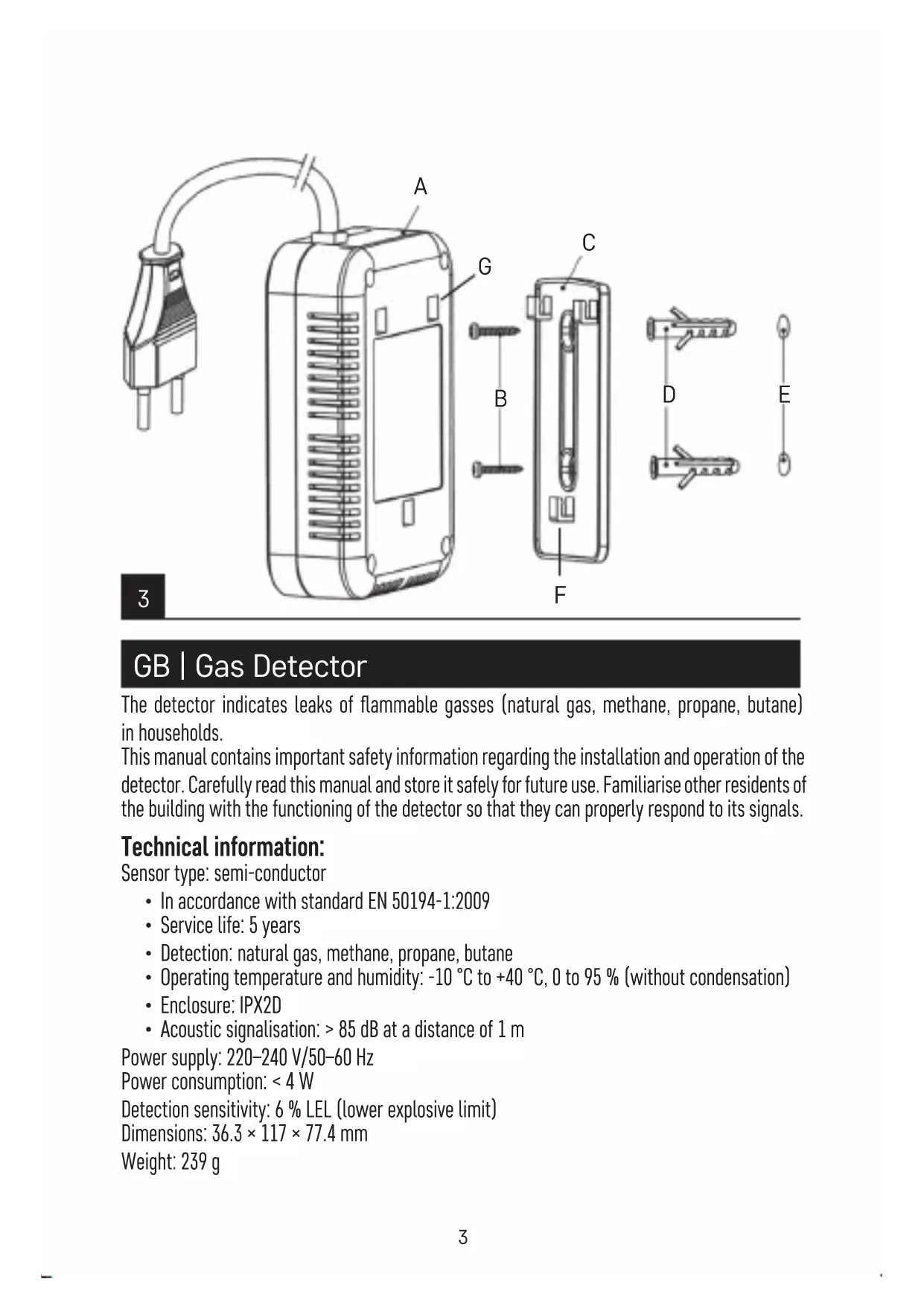 GB | Gas Detector The detector indicates leaks of ammable gasses (natural gas, methane, propane, butane) in households. This manual contains important safety information regarding the installation and operation of the detector. Carefully read this manual and store it safely for future use. Familiarise other residents of the building with the functioning of the detector so that they can properly respond to its signals. Technical information: Sensor type: semi-conductor
