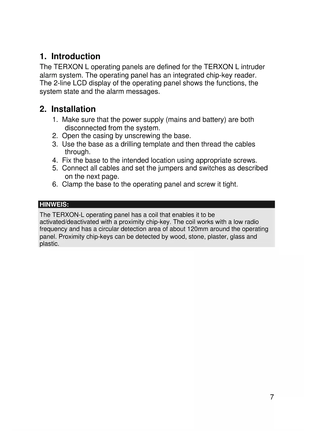 HINWEIS: The TERXON-L operating panel has a coil that enables it to be activated/deactivated with a proximity chip-key. The coil works with a low radio frequency and has a circular detection area of about 120mm around the operating panel. Proximity chip-keys can be detected by wood, stone, plaster, glass and plastic.8