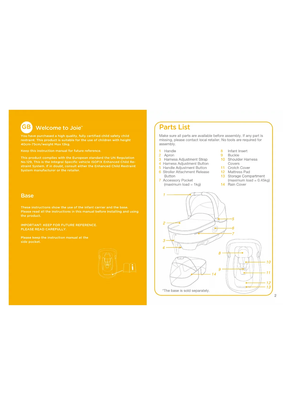 *The base is sold separately. Make sure all parts are available before assembly. If any part is missing, please contact local retailer. No tools are required for assembly. 1 Handle 2 Apron 3 Harness Adjustment Strap 4 Harness Adjustment Button 5 Handle Adjustment Button 6 Stroller Attachment Release Button 7 Accessory Pocket (maximum load = 1kg) Parts List 8 Infant Insert 9 Buckle 10 Shoulder Harness Covers 11 Crotch Cover 12 Mattress Pad 13 Storage Compartment (maximum load = 0.45kg) 14 Rain Cover