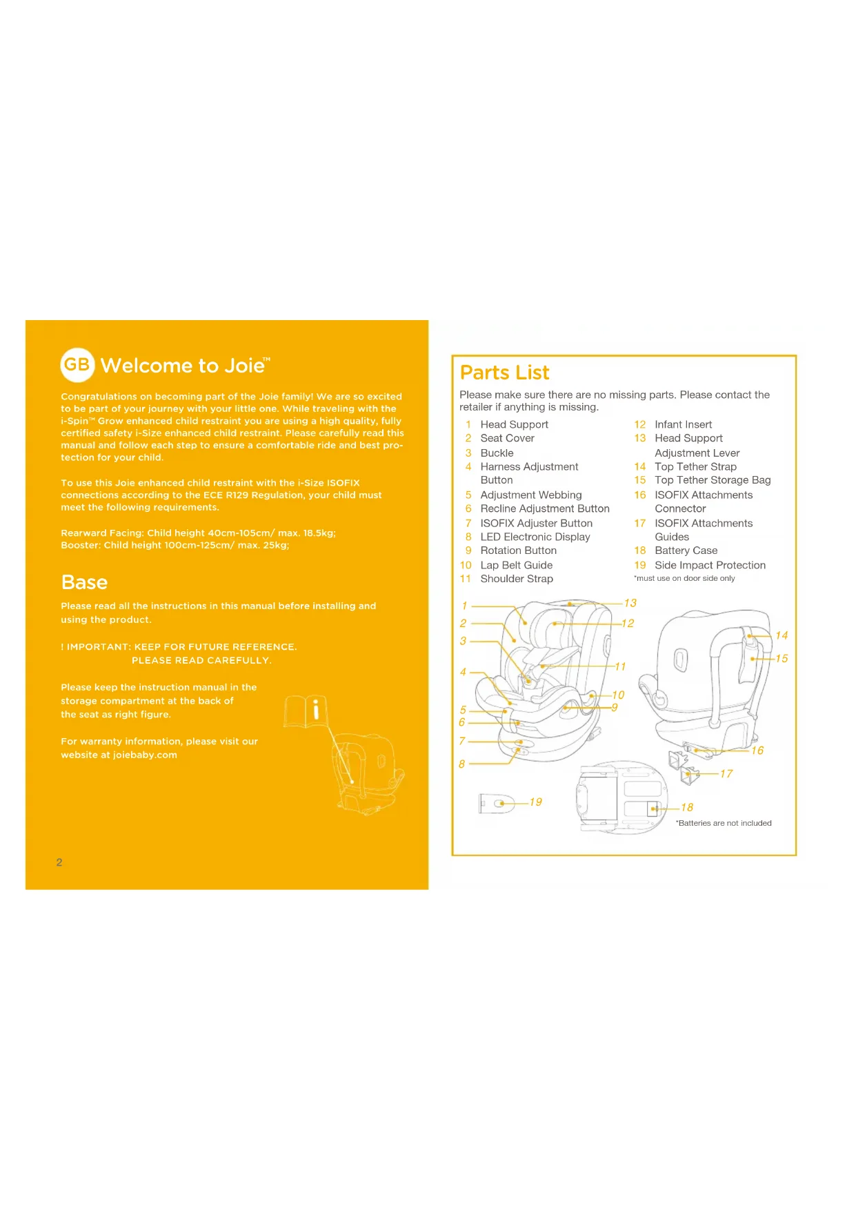 Congratulations on becoming part of the Joie family! We are so excited to be part of your journey with your little one. While traveling with the i-Spin™ Grow enhanced child restraint you are using a high quality, fully certified safety i-Size enhanced child restraint. Please carefully read this manual and follow each step to ensure a comfortable ride and best pro-tection for your child.To use this Joie enhanced child restraint with the i-Size ISOFIX connections according to the ECE R129 Regulation, your child must meet the following requirements.Rearward Facing: Child height 40cm-105cm/ max. 18.5kg;Booster: Child height 100cm-125cm/ max. 25kg; Base Please read all the instructions in this manual before installing and using the product.! IMPORTANT: KEEP FOR FUTURE REFERENCE. PLEASE READ CAREFULLY.Please keep the instruction manual in the storage compartment at the back of the seat as right figure. For warranty information, please visit our website at joiebaby.com Parts List 1 Head Support 2 Seat Cover 3 Buckle 4 Harness Adjustment Button 5 Adjustment Webbing 6 Recline Adjustment Button 7 ISOFIX Adjuster Button 8 LED Electronic Display 9 Rotation Button10 Lap Belt Guide11 Shoulder Strap12 Infant Insert13 Head Support Adjustment Lever14 Top Tether Strap15 Top Tether Storage Bag16 ISOFIX Attachments Connector17 ISOFIX Attachments Guides 18 Battery Case19 Side Impact Protection *must use on door side onlyPlease make sure there are no missing parts. Please contact the retailer if anything is missing.