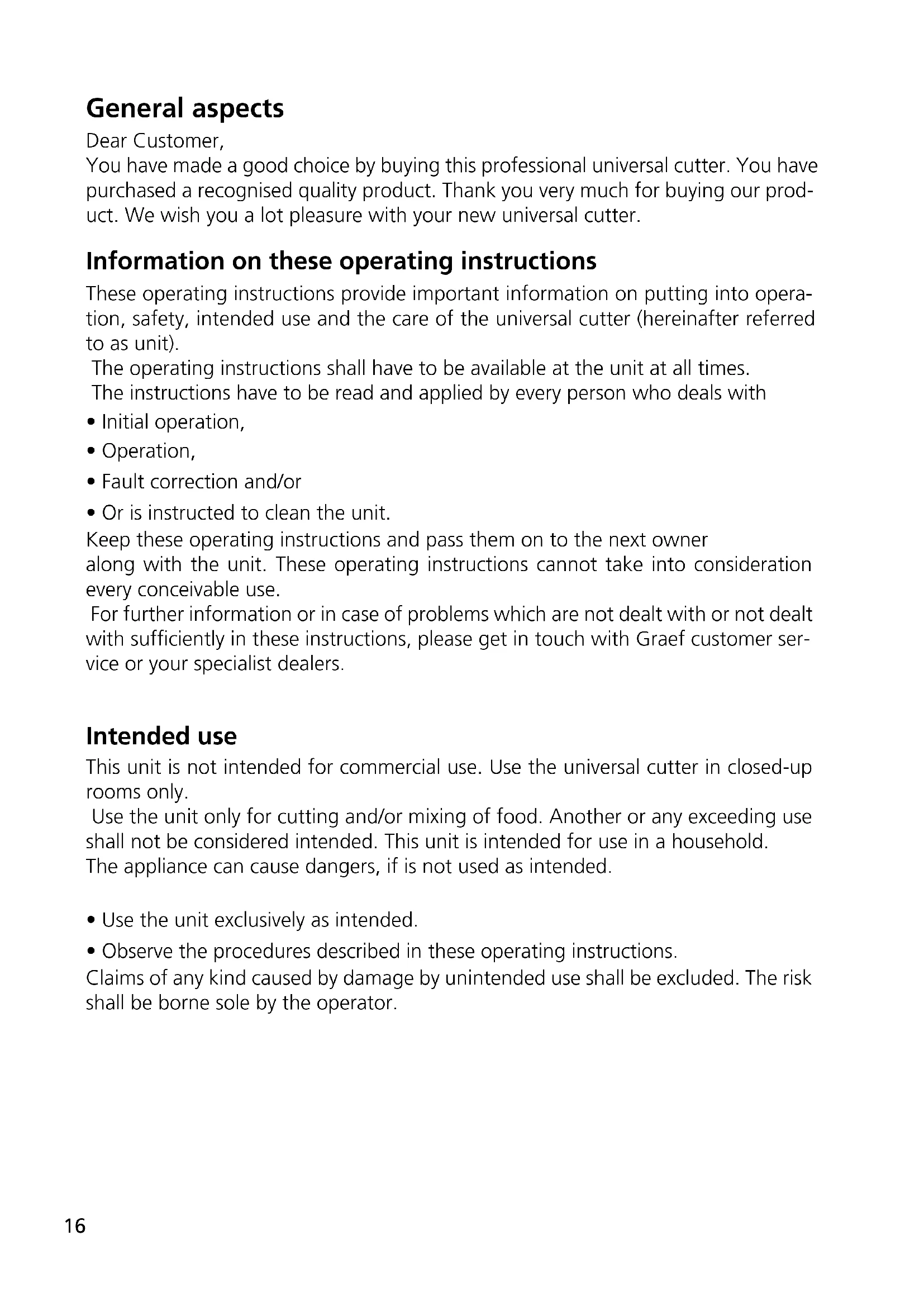 - Or is instructed to clean the unit. Keep these operating instructions and pass them on to the next owner along with the unit. These operating instructions cannot take into consideration every conceivable use. For further information or in case of problems which are not dealt with or not dealt with sufciently in these instructions, please get in touch with Graef customer ser- vice or your specialist dealers. Intended use This unit is not intended for commercial use. Use the universal cutter in closed-up rooms only. Use the unit only for cutting and/or mixing of food. Another or any exceeding use shall not be considered intended. This unit is intended for use in a household. The appliance can cause dangers, if is not used as intended.