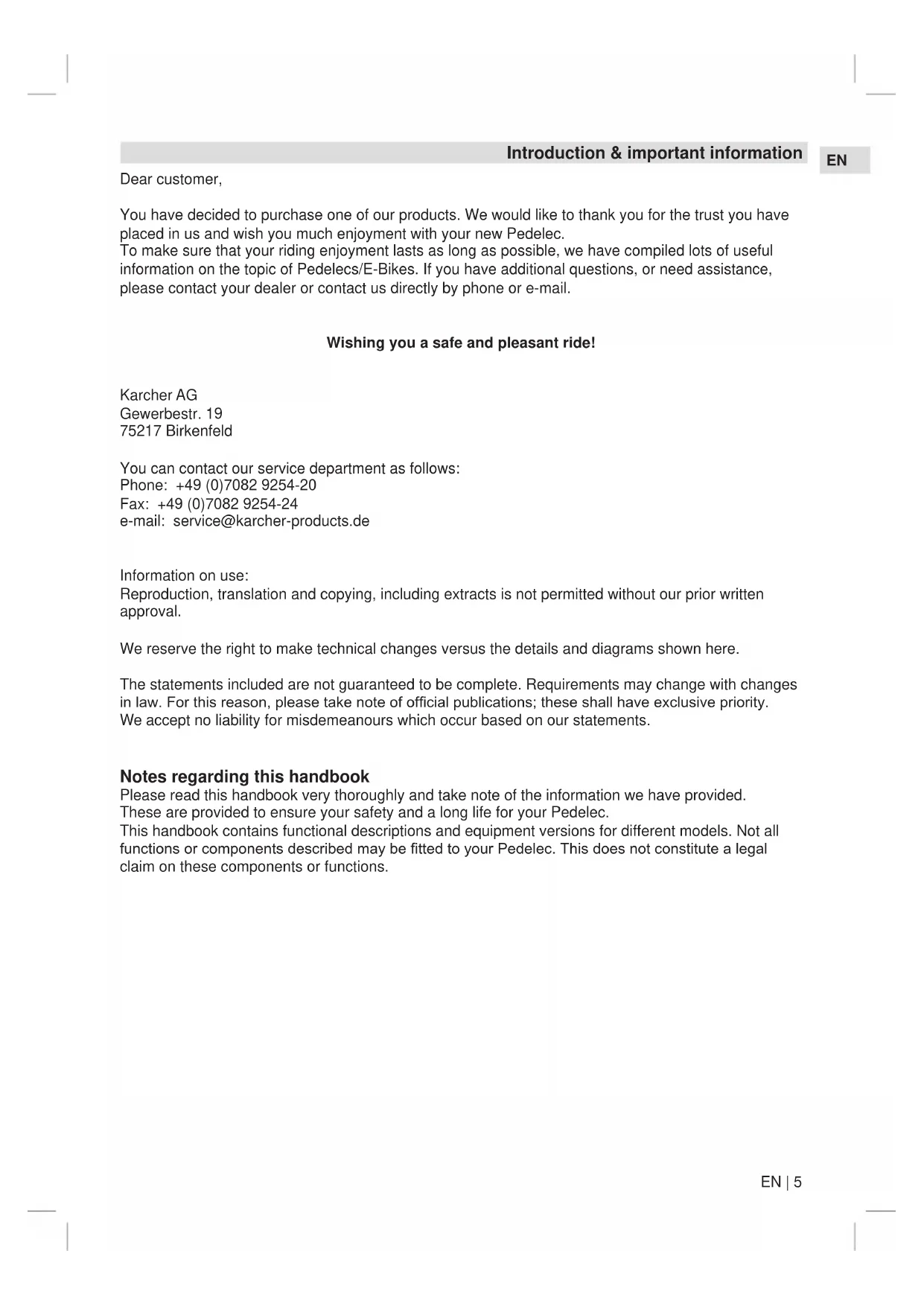 Dear customer, You have decided to purchase one of our products. We would like to thank you for the trust you have placed in us and wish you much enjoyment with your new Pedelec. To make sure that your riding enjoyment lasts as long as possible, we have compiled lots of useful information on the topic of Pedelecs/E-Bikes. If you have additional questions, or need assistance, please contact your dealer or contact us directly by phone or e-mail. Wishing you a safe and pleasant ride! Karcher AG Gewerbestr. 19 75217 Birkenfeld You can contact our service department as follows: Phone: +49 (0)7082 9254-20 Fax: +49 (0)7082 9254-24 e-mail: service@karcher-products.de Information on use: Reproduction, translation and copying, including extracts is not permitted without our prior written approval. We reserve the right to make technical changes versus the details and diagrams shown here. The statements included are not guaranteed to be complete. Requirements may change with changes in law. For this reason, please take note of ofcial publications; these shall have exclusive priority. We accept no liability for misdemeanours which occur based on our statements. Notes regarding this handbook Please read this handbook very thoroughly and take note of the information we have provided. These are provided to ensure your safety and a long life for your Pedelec. This handbook contains functional descriptions and equipment versions for different models. Not all functions or components described may be tted to your Pedelec. This does not constitute a legal claim on these components or functions.Introduction & important information 6 | EN Intended use Only use this Pedelec on the terrain for which it has ben built and approved. Never overload your bike. Riding on unsuitable terrain or with excessive load leads to increased wear and can result in component failing. Risk of crashing! K archer AG Pedelecs are exclusively intended for private use. If you intend to use a child seat on the luggage rack, please comply with the maximum permitted total weight on the rack (as specied on the rack) as well as the permitted total weight of the child seat manufacturer. Carefully enclose the spring rings under the saddle to prevent the child’s ngers being trapped. If child trailers or tag-alongs are tted, please ensure that these are tted correctly according to the manufacturer’s operating manual, and that the permitted total weight is taken into account. Only use tested child seats, child trailers and tag-alongs (e.g. DIN/GS-tested) and in all cases make sure that they are assembled correctly as per the manufacturer’s instructions. If in doubt, speak to your local dealer. If the maximum permitted total weight on the rack (as specied on the rack) is less than 27 kg, then the rack is not suitable for mounting a child seat. Special notes for Pedelecs Pedelec applications