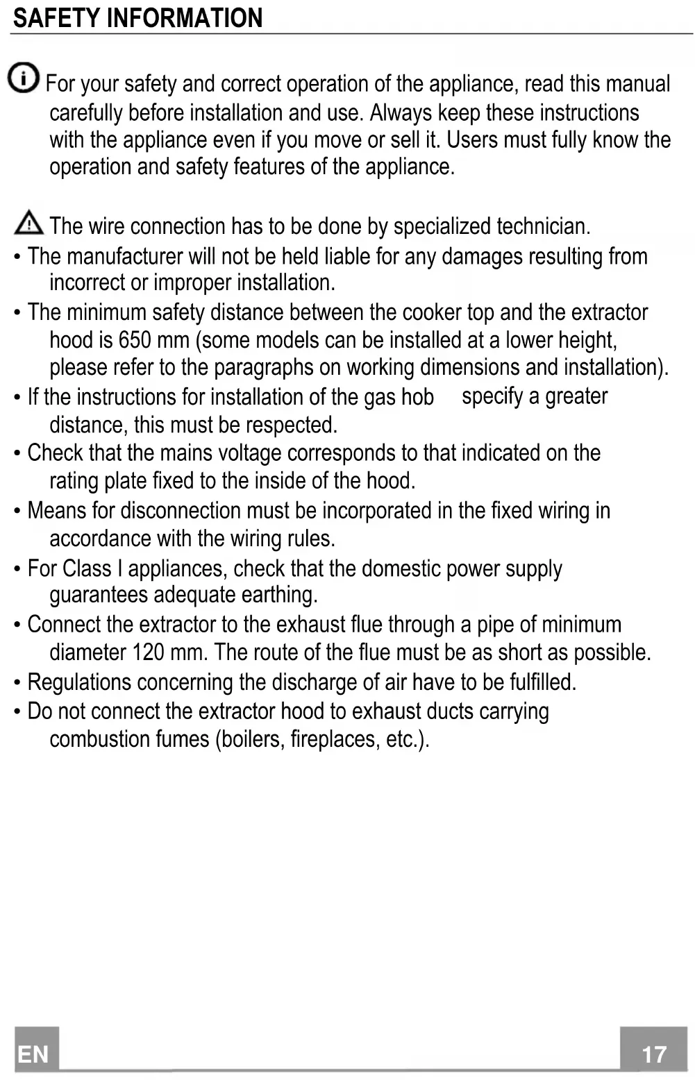 - Do not connect the extractor hood to exhaust ducts carrying combustion fumes (boilers, fireplaces, etc.).EN