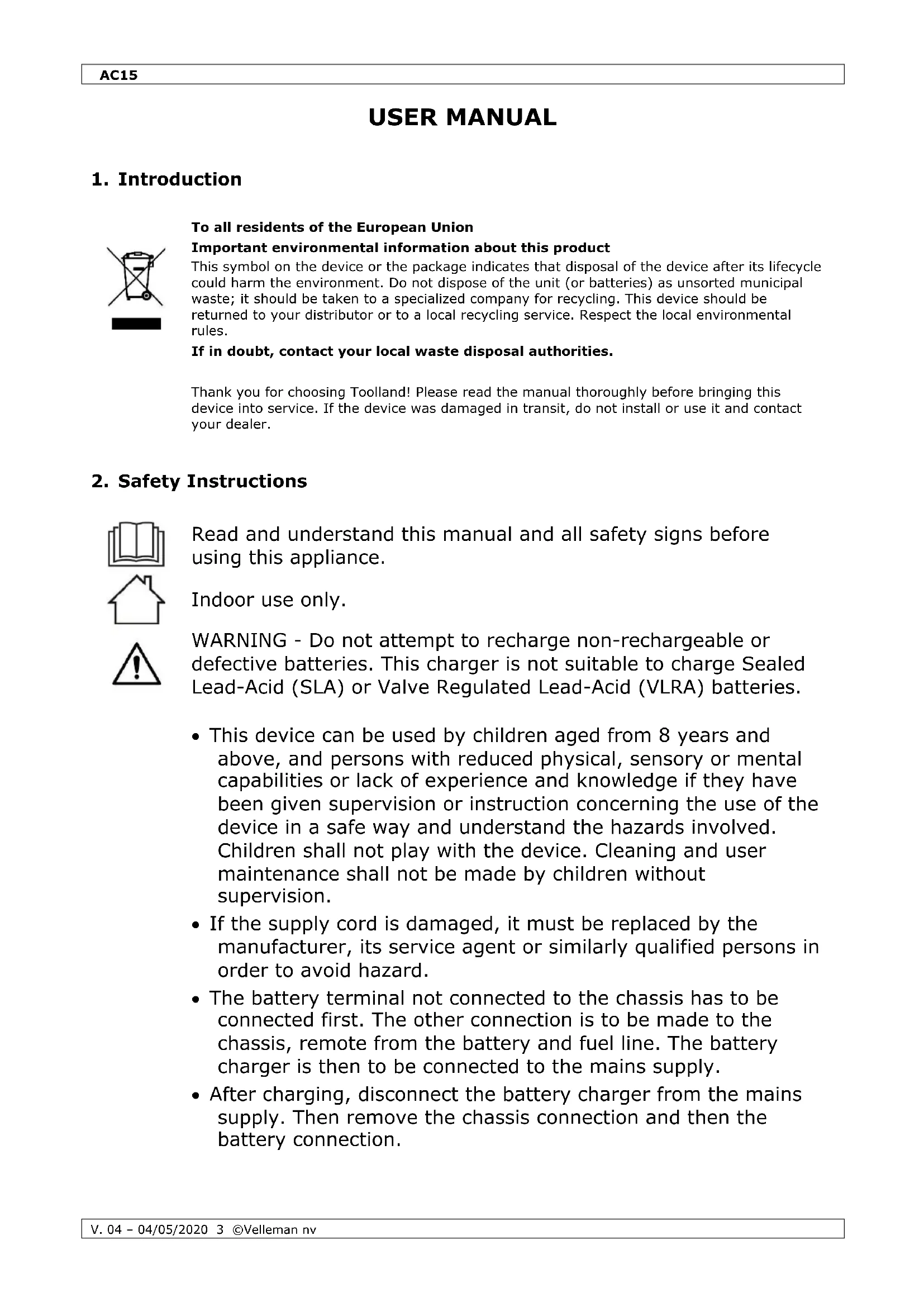 Download the instructions for your Battery charger in PDF format for free! Find your manual AC15 - Toolland and take your electronic device back in hand. On this page are published all the documents necessary for the use of your device. AC15 by Toolland.