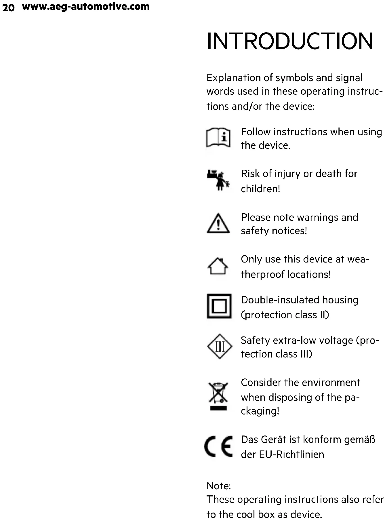 INTRODUCTION Explanation of symbols and signal words used in these operating instruc- tions and/or the device: Follow instructions when using the device. Risk of injury or death for children! Please note warnings and safety notices! Only use this device at wea- therproof locations! Double-insulated housing (protection class II) Safety extra-low voltage (pro- tection class III) Consider the environment when disposing of the pa- ckaging! Das Gerät ist konform gemäß der EU-Richtlinien Note: These operating instructions also refer to the cool box as device.English 21 Intended use The cool box is used to cool food and beverages. Cooling is achieved using an electrothermal transducer (Peltier ele- ment) with a fan. It connects to power via the car adapter (12 V) or a 230 V power supply. This device is not intended for storing and transporting unpackaged foods. This device may be used by children age eight (8) years and up and persons with limited physical, sensory or mental capacity or lacking experience and/ or knowledge when supervised or instructed on the safe use of the device and having understood the risks in- volved. Children must not play with this device. Cleaning and user maintenance must not be performed by children without supervision. This device is not intended for com- mercial use. Any other use or modication of the device is considered improper and involves signicant risks. The manufac- turer assumes no liability for damages due to improper use. Contents Be sure to verify contents immediately upon opening the product. Check the product and all parts for damage. Do not use a defective product or parts.