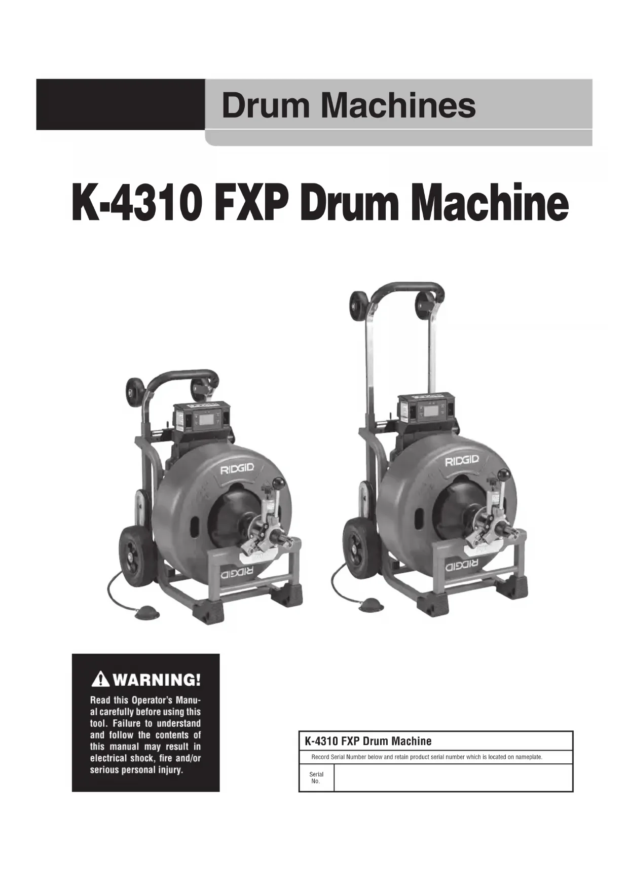 K-4310 FXP Drum Ma- chine, read and understand: – This operator’s manual – The FXP Battery/Charger manual – The FXP Power Adapter manual – The instructions for any other equipment or material used with this tool. Failure to follow all instructions and warnings may result in property damage and/or serious injury. RIDGID Contact Information If you have any question concerning this RIDGID