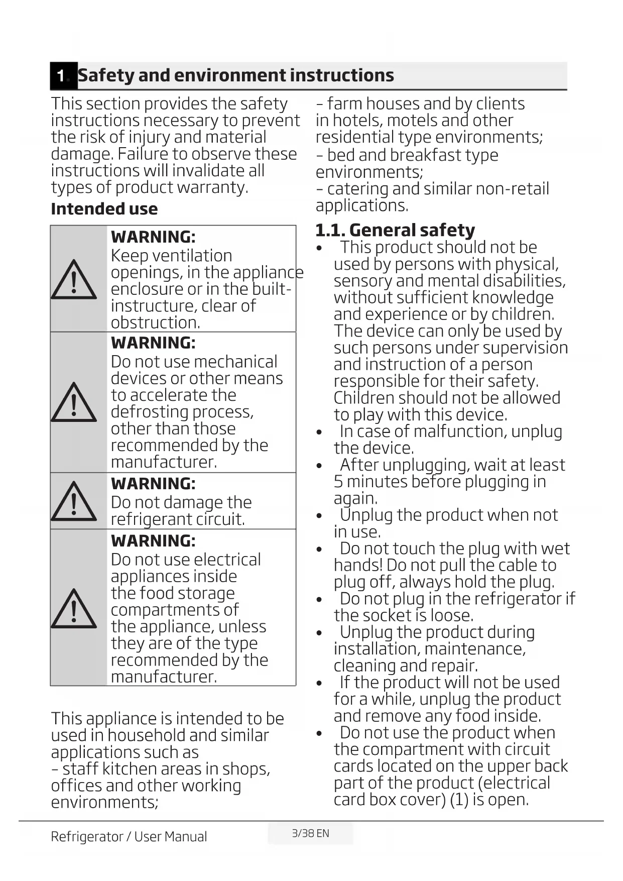 Contents3/38 EN Refrigerator / User Manual This section provides the safety instructions necessary to prevent the risk of injury and material damage. Failure to observe these instructions will invalidate all types of product warranty. Intended use
