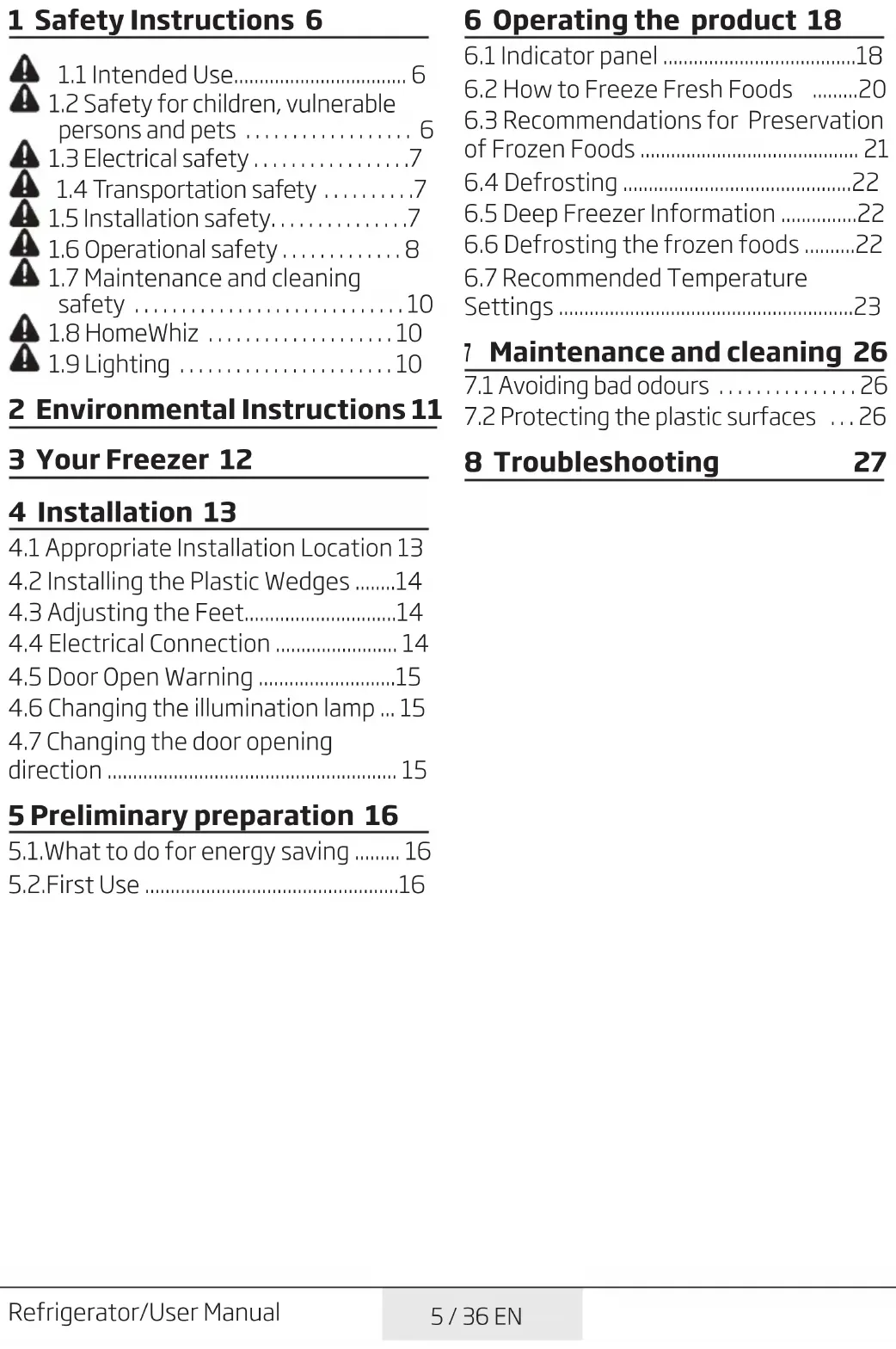 - Never throw the product into fire for disposal. There is the risk of explosion! 1 Safety Instructions7 / 36 EN Refrigerator/User Manual Safety and environment instructions