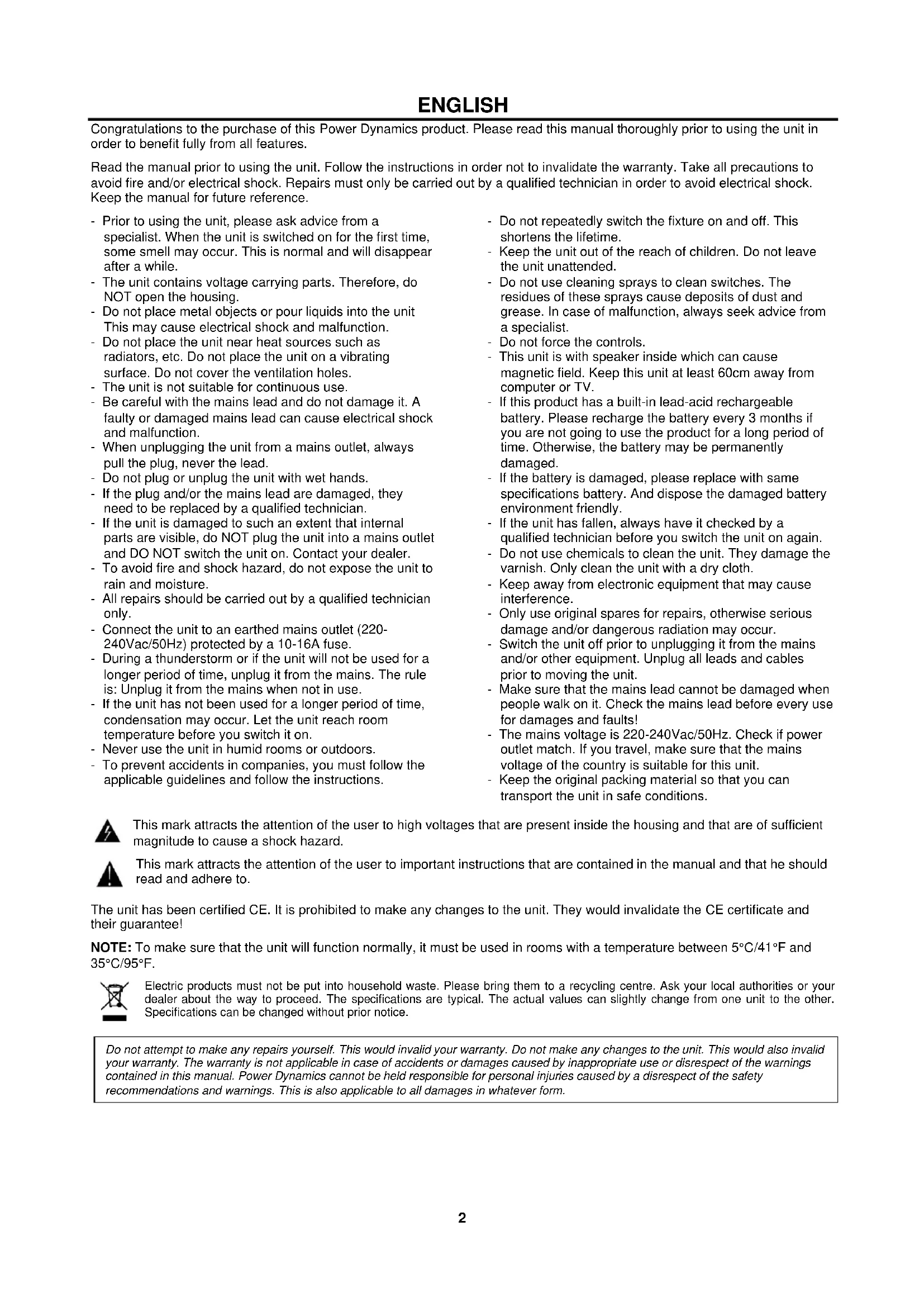 V1.02 ENGLISH Congratulations to the purchase of this Power Dynamics product. Please read this manual thoroughly prior to using the unit in order to benefit fully from all features. Read the manual prior to using the unit. Follow the instructions in order not to invalidate the warranty. Take all precautions to avoid fire and/or electrical shock. Repairs must only be carried out by a qualified technician in order to avoid electrical shock. Keep the manual for future reference. - Prior to using the unit, please ask advice from a specialist. When the unit is switched on for the first time, some smell may occur. This is normal and will disappear after a while. - The unit contains voltage carrying parts. Therefore, do NOT open the housing. - Do not place metal objects or pour liquids into the unit This may cause electrical shock and malfunction. - Do not place the unit near heat sources such as radiators, etc. Do not place the unit on a vibrating surface. Do not cover the ventilation holes. - The unit is not suitable for continuous use. - Be careful with the mains lead and do not damage it. A faulty or damaged mains lead can cause electrical shock and malfunction. - When unplugging the unit from a mains outlet, always pull the plug, never the lead. - Do not plug or unplug the unit with wet hands. - If the plug and/or the mains lead are damaged, they need to be replaced by a qualified technician. - If the unit is damaged to such an extent that internal parts are visible, do NOT plug the unit into a mains outlet and DO NOT switch the unit on. Contact your dealer. - To avoid fire and shock hazard, do not expose the unit to rain and moisture. - All repairs should be carried out by a qualified technician only. - Connect the unit to an earthed mains outlet (220- 240Vac/50Hz) protected by a 10-16A fuse. - During a thunderstorm or if the unit will not be used for a longer period of time, unplug it from the mains. The rule is: Unplug it from the mains when not in use. - If the unit has not been used for a longer period of time, condensation may occur. Let the unit reach room temperature before you switch it on. - Never use the unit in humid rooms or outdoors. - To prevent accidents in companies, you must follow the applicable guidelines and follow the instructions. - Do not repeatedly switch the fixture on and off. This shortens the lifetime. - Keep the unit out of the reach of children. Do not leave the unit unattended. - Do not use cleaning sprays to clean switches. The residues of these sprays cause deposits of dust and grease. In case of malfunction, always seek advice from a specialist. - Do not force the controls. - This unit is with speaker inside which can cause magnetic field. Keep this unit at least 60cm away from computer or TV. - If this product has a built-in lead-acid rechargeable battery. Please recharge the battery every 3 months if you are not going to use the product for a long period of time. Otherwise, the battery may be permanently damaged. - If the battery is damaged, please replace with same specifications battery. And dispose the damaged battery environment friendly. - If the unit has fallen, always have it checked by a qualified technician before you switch the unit on again. - Do not use chemicals to clean the unit. They damage the varnish. Only clean the unit with a dry cloth. - Keep away from electronic equipment that may cause interference. - Only use original spares for repairs, otherwise serious damage and/or dangerous radiation may occur. - Switch the unit off prior to unplugging it from the mains and/or other equipment. Unplug all leads and cables prior to moving the unit. - Make sure that the mains lead cannot be damaged when people walk on it. Check the mains lead before every use for damages and faults! - The mains voltage is 220-240Vac/50Hz. Check if power outlet match. If you travel, make sure that the mains voltage of the country is suitable for this unit. - Keep the original packing material so that you can transport the unit in safe conditions. This mark attracts the attention of the user to high voltages that are present inside the housing and that are of sufficient magnitude to cause a shock hazard. This mark attracts the attention of the user to important instructions that are contained in the manual and that he should read and adhere to. The unit has been certified CE. It is prohibited to make any changes to the unit. They would invalidate the CE certificate and their guarantee! NOTE: To make sure that the unit will function normally, it must be used in rooms with a temperature between 5°C/41°F and 35°C/95°F. Electric products must not be put into household waste. Please bring them to a recycling centre. Ask your local authorities or your dealer about the way to proceed. The specifications are typical. The actual values can slightly change from one unit to the other. Specifications can be changed without prior notice. Do not attempt to make any repairs yourself. This would invalid your warranty. Do not make any changes to the unit. This would also invalid your warranty. The warranty is not applicable in case of accidents or damages caused by inappropriate use or disrespect of the warnings contained in this manual. Power Dynamics cannot be held responsible for personal injuries caused by a disrespect of the safety recommendations and warnings. This is also applicable to all damages in whatever form.3 UNPACKING INSTRUCTION CAUTION! Carefully unpack the box upon receipt. Check the contents to ensure that all parts are present and have been received in good condition. Notify the shipper immediately and retain packaging material if any parts appear damaged from shipping or the package itself shows signs of mishandling. Save the package and all packaging materials. If the product must be returned, it is important that the product is returned in the original factory box and packaging. If the device has been exposed to drastic temperature fluctuation (e.g. afte