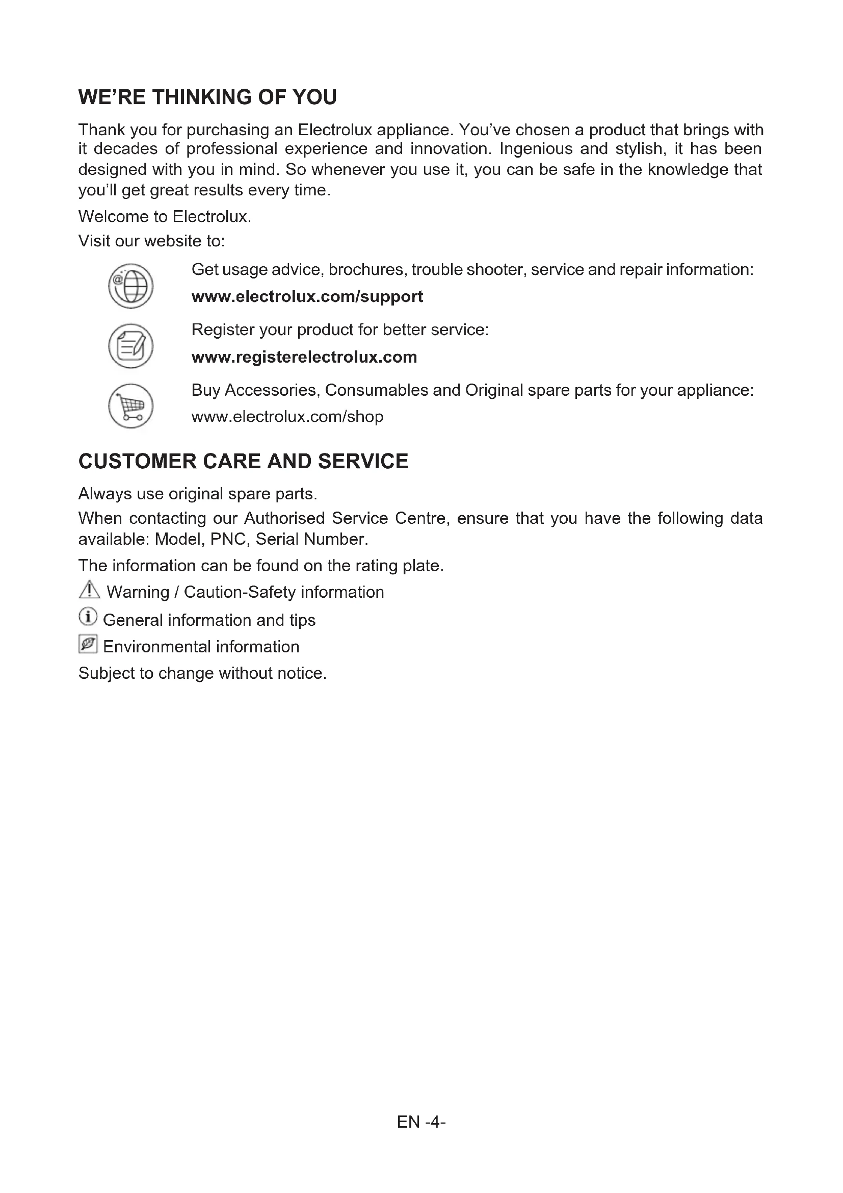 Always use original spare parts. When contacting our Authorised Service Centre, ensure that you have the following data available: Model, PNC, Serial Number. The information can be found on the rating plate. Warning / Caution-Safety information General information and tips Environmental information Subject to change without notice.EN -5-