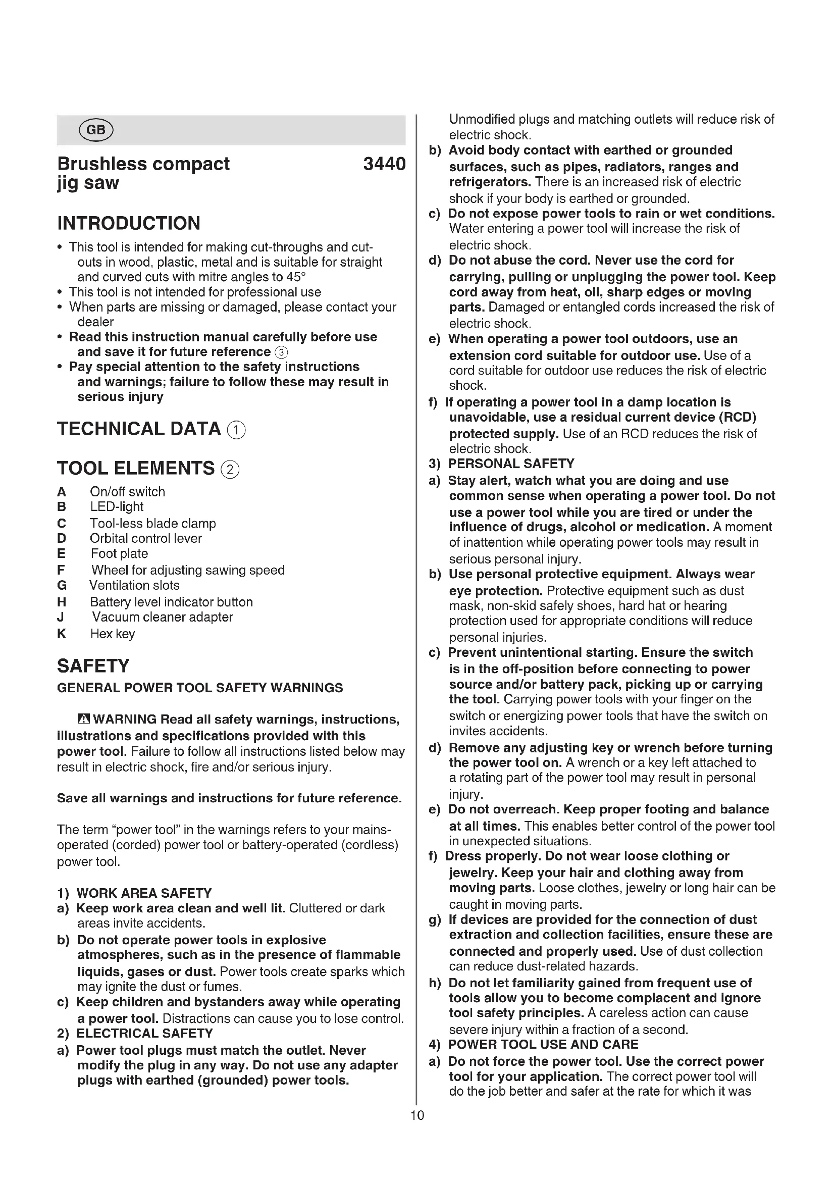 - Pay special attention to the safety instructions and warnings; failure to follow these may result in serious injury TECHNICAL DATA 1 TOOL ELEMENTS 2 A On/o switch B LED-light C Tool-less blade clamp D Orbital control lever E Foot plate F Wheel for adjusting sawing speed G Ventilation slots H Battery level indicator button