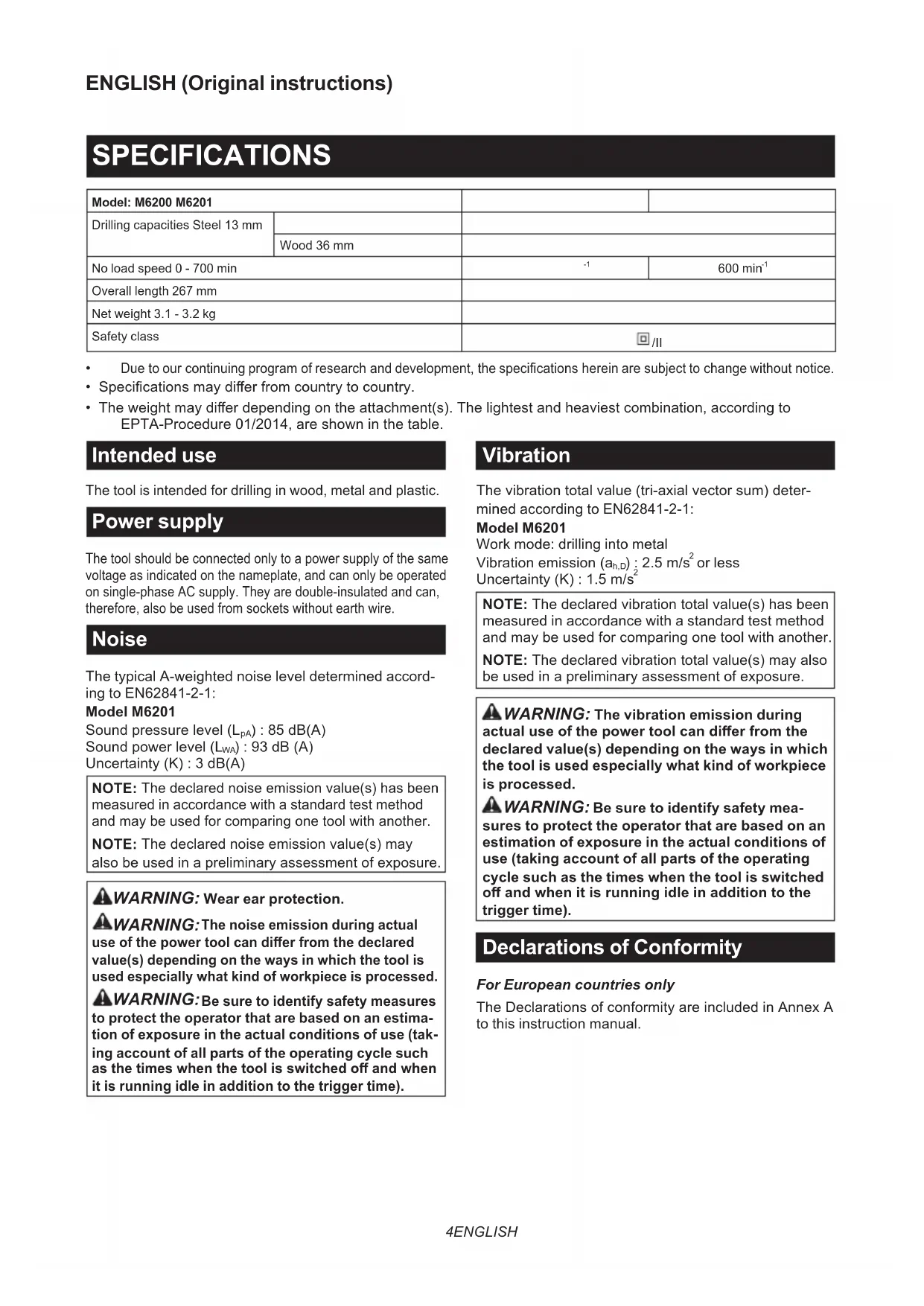 - The weight may dier depending on the attachment(s). The lightest and heaviest combination, according to EPTA-Procedure 01/2014, are shown in the table. Intended use The tool is intended for drilling in wood, metal and plastic. Power supply The tool should be connected only to a power supply of the same voltage as indicated on the nameplate, and can only be operated on single-phase AC supply. They are double-insulated and can, therefore, also be used from sockets without earth wire. Noise The typical A-weighted noise level determined accord- ing to EN62841-2-1: Model M6201 Sound pressure level (L