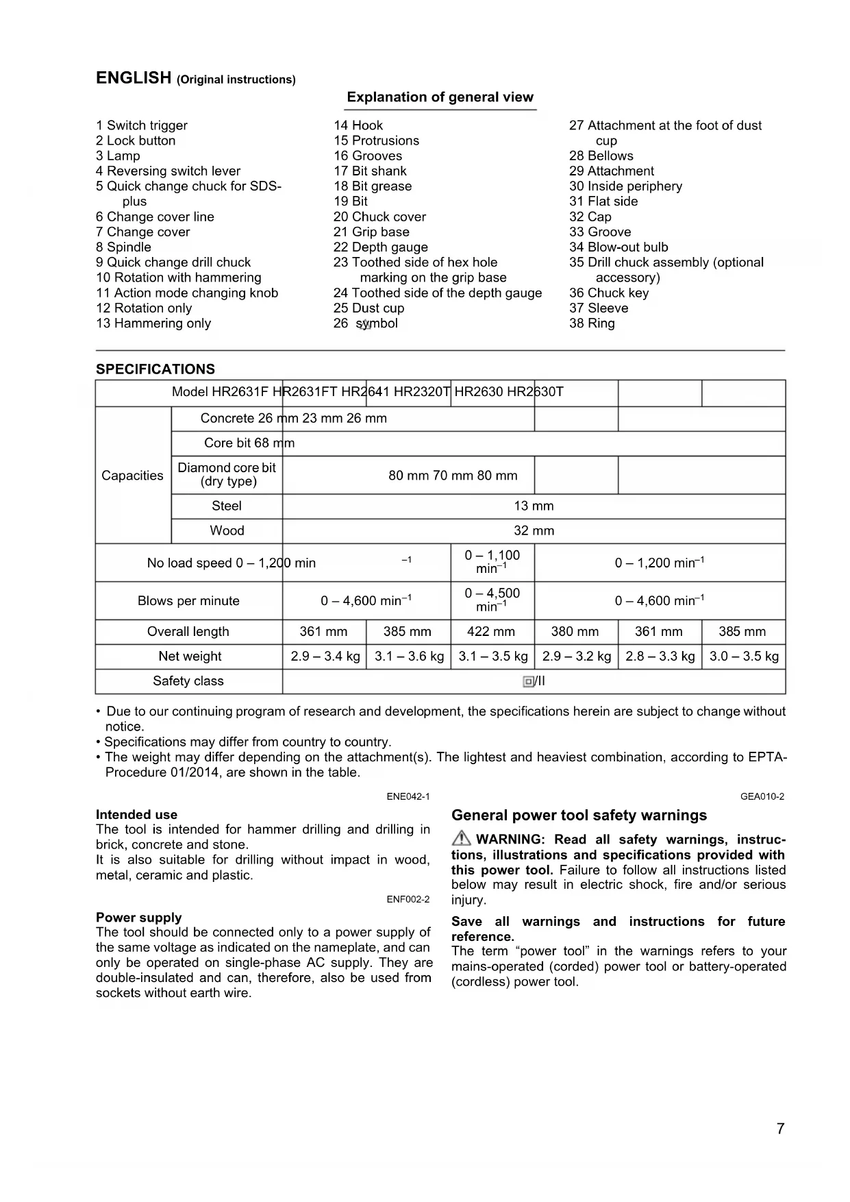- The weight may differ depending on the attachment(s). The lightest and heaviest combination, according to EPTA- Procedure 01/2014, are shown in the table. ENE042-1 Intended use The tool is intended for hammer drilling and drilling in brick, concrete and stone. It is also suitable for drilling without impact in wood, metal, ceramic and plastic. ENF002-2 Power supply The tool should be connected only to a power supply of the same voltage as indicated on the nameplate, and can only be operated on single-phase AC supply. They are double-insulated and can, therefore, also be used from sockets without earth wire. GEA010-2 General power tool safety warnings