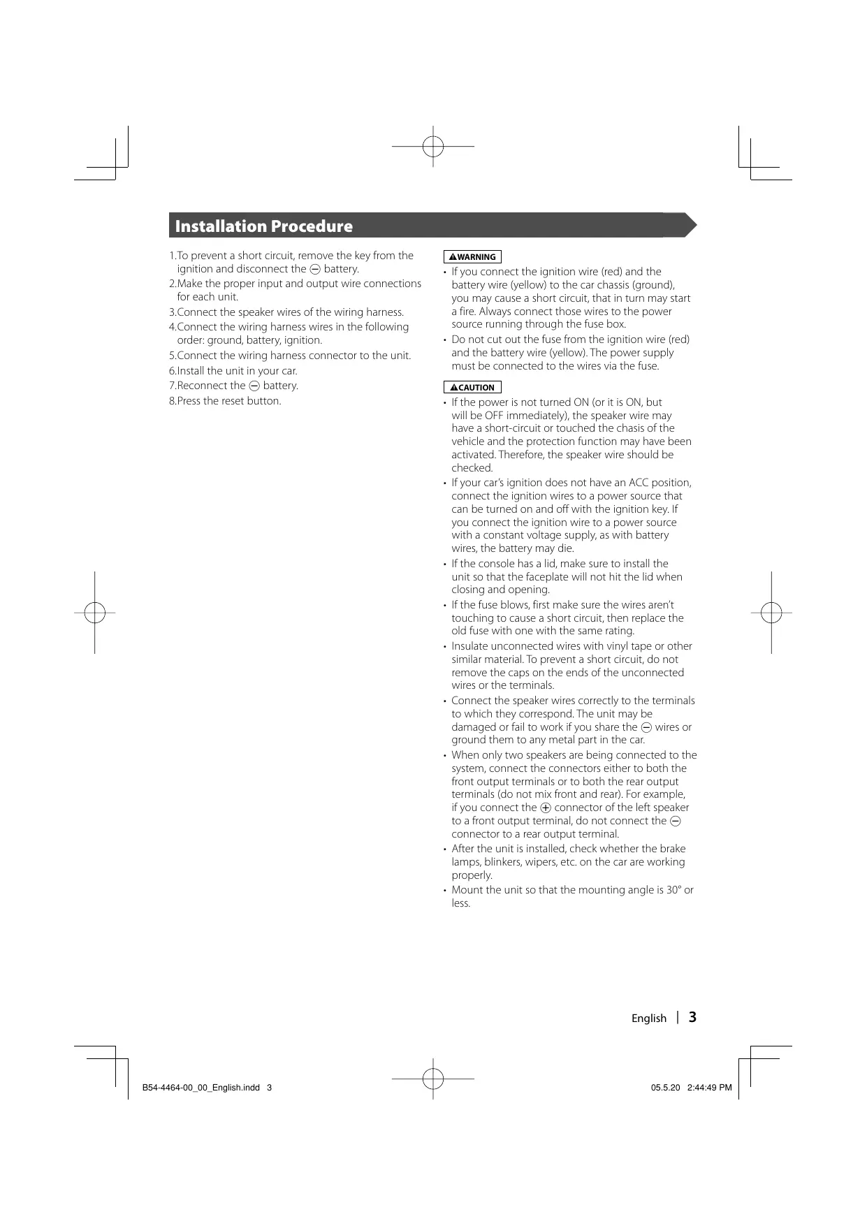 - Do not cut out the fuse from the ignition wire (red) and the battery wire (yellow). The power supply must be connected to the wires via the fuse. 2CAUTION