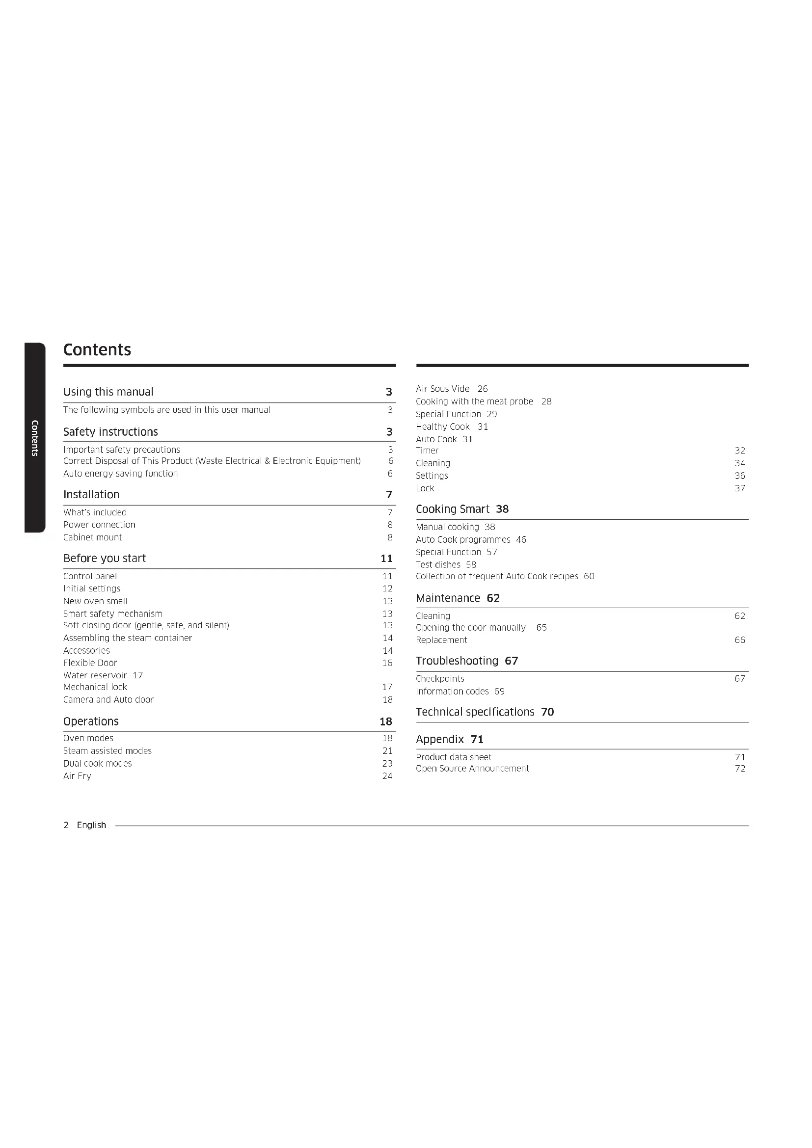 Product data sheet 71 Open Source Announcement 72 Contents Using this manual 3 The following symbols are used in this user manual 3 Safety instructions 3 Important safety precautions 3 Correct Disposal of This Product (Waste Electrical & Electronic Equipment) 6 Auto energy saving function 6 Installation 7 What’s included 7 Power connection 8 Cabinet mount 8 Before you start 11 Control panel 11 Initial settings 12 New oven smell 13 Smart safety mechanism 13 Soft closing door (gentle, safe, and silent) 13 Assembling the steam container 14 Accessories 14 Flexible Door 16 Water reservoir 17 Mechanical lock 17 Camera and Auto door 18 Operations 18 Oven modes 18 Steam assisted modes 21 Dual cook modes 23 Air Fry 24English 3 Using this manual Safety instructions Installation of this oven must be performed only by a licensed electrician. The installer is responsible for connecting the appliance to the mains power supply in observance of the relevant safety recommendations.