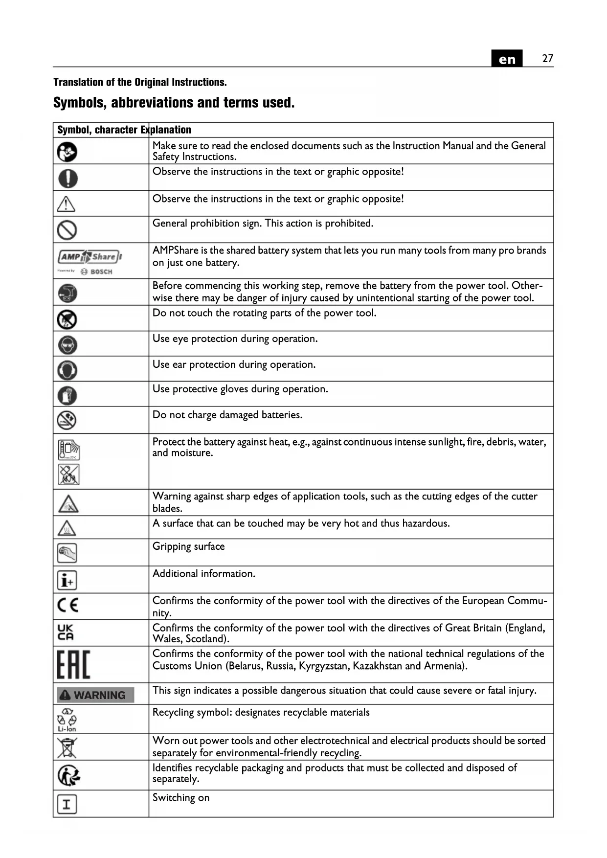 Translation of the Original Instructions. Symbols, abbreviations and terms used. Symbol, character Explanation Make sure to read the enclosed documents such as the Instruction Manual and the General Safety Instructions. Observe the instructions in the text or graphic opposite! Observe the instructions in the text or graphic opposite! General prohibition sign. This action is prohibited. AMPShare is the shared battery system that lets you run many tools from many pro brands on just one battery. Before commencing this working step, remove the battery from the power tool. Other- wise there may be danger of injury caused by unintentional starting of the power tool. Do not touch the rotating parts of the power tool. Use eye protection during operation. Use ear protection during operation. Use protective gloves during operation. Do not charge damaged batteries. Protect the battery against heat, e.g., against continuous intense sunlight, fire, debris, water, and moisture. Warning against sharp edges of application tools, such as the cutting edges of the cutter blades. A surface that can be touched may be very hot and thus hazardous. Gripping surface Additional information. Confirms the conformity of the power tool with the directives of the European Commu- nity. Confirms the conformity of the power tool with the directives of Great Britain (England, Wales, Scotland). Confirms the conformity of the power tool with the national technical regulations of the Customs Union (Belarus, Russia, Kyrgyzstan, Kazakhstan and Armenia). This sign indicates a possible dangerous situation that could cause severe or fatal injury. Recycling symbol: designates recyclable materials Worn out power tools and other electrotechnical and electrical products should be sorted separately for environmental-friendly recycling. Identifies recyclable packaging and products that must be collected and disposed of separately. Switching on max.50°C WARNING28