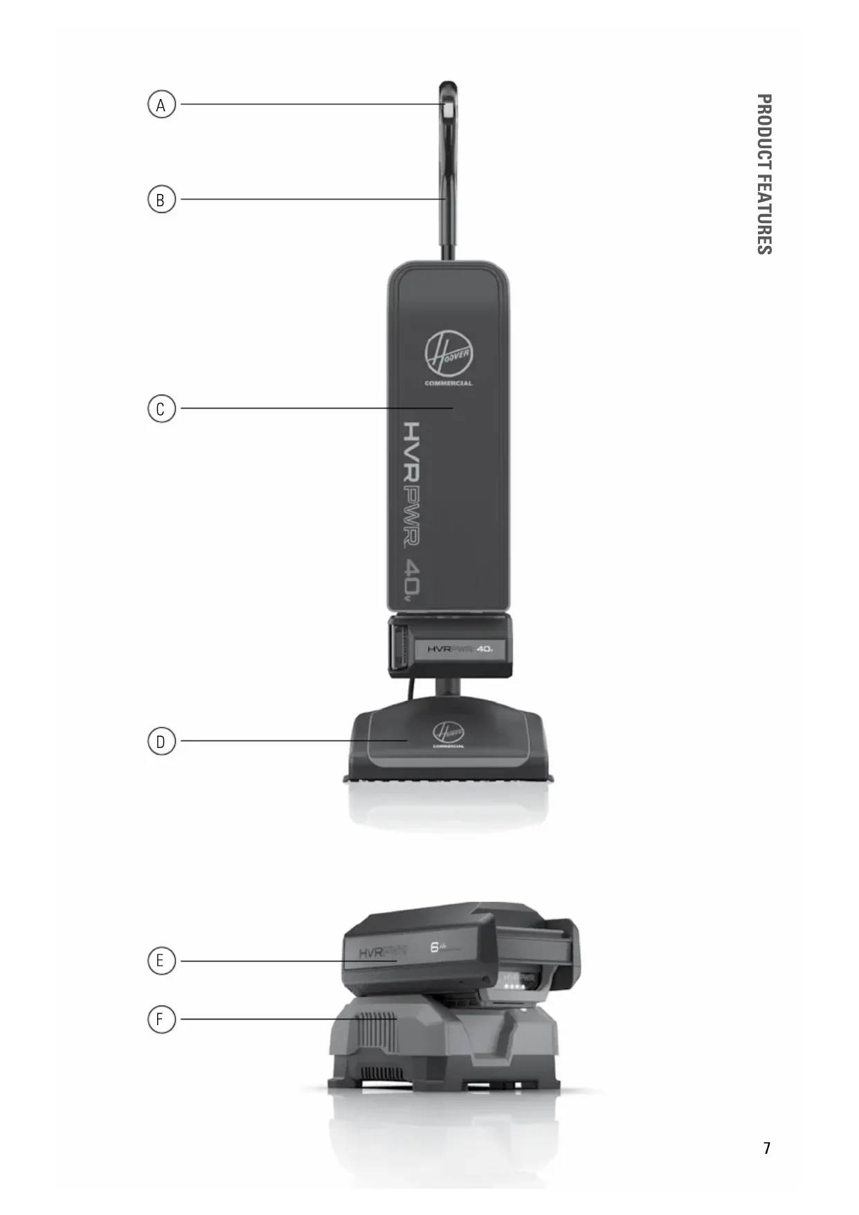 A POLARIZED PLUG (ONE BLADE IS WIDER THAN THE OTHER). THIS PLUG WILL FIT IN A POLARIZED OUTLET ONLY ONE WAY. IF THE PLUG DOES NOT FIT FULLY IN THE OUTLET, REVERSE THE PLUG. IF IT STILL DOES NOT FIT, CONTACT A QUALIFIED ELECTRICIAN TO INSTALL THE PROPER OUTLET. DO NOT CHANGE THE PLUG IN ANY WAY. BATTERY DISPOSAL WARNING: RISK OF EXPLOSION OR EXPOSURE TO TOXIC MATERIAL. CAUTION: The battery used in this device may present a risk of re or chemical burn if mistreated. Do not disassemble, heat above manufacturer’s maximum temperature limit (40°C/104°F), or incinerate. Replace battery with Hoover Commercial Battery Part #CH27260 , CH17360 only. Use of another battery may present a risk of re or explosion. Dispose of used battery promptly. Keep away from children. Do not disassemble and do not dispose of in re. Do not attempt to disassemble the battery or remove any component projecting from the battery terminals. The battery and charger have no user serviceable parts. Fire or injury may result. Prior to disposal, protect exposed terminals with heavy insulating tape to prevent shorting. LITHIUM-ION BATTERIES: The battery must be collected, recycled or disposed of in an environmentally sound manner. The EPA certied RBRC Battery Recycling Seal on the lithium-ion (Li-ion) battery indicated Techtronic Industries, a corporate afliate of Hoover Commercial, is voluntarily participating in an industry program to collect and recycle these batteries at the end of their useful life, when taken out of service in the United States or Canada. The RBRC program provides a convenient alternative to placing used Li-ion batteries into the trash or the municipal waste stream, which may be illegal in your area. Please visit www.rbrc.org/call2recycle/ for information on Li-ion battery recycling and disposal bans/restrictions in your area. Hoover Commercial involvement in this program is part of our commitment to preserving our environment and conserving our natural resources.6 Product Features Carton Contents
