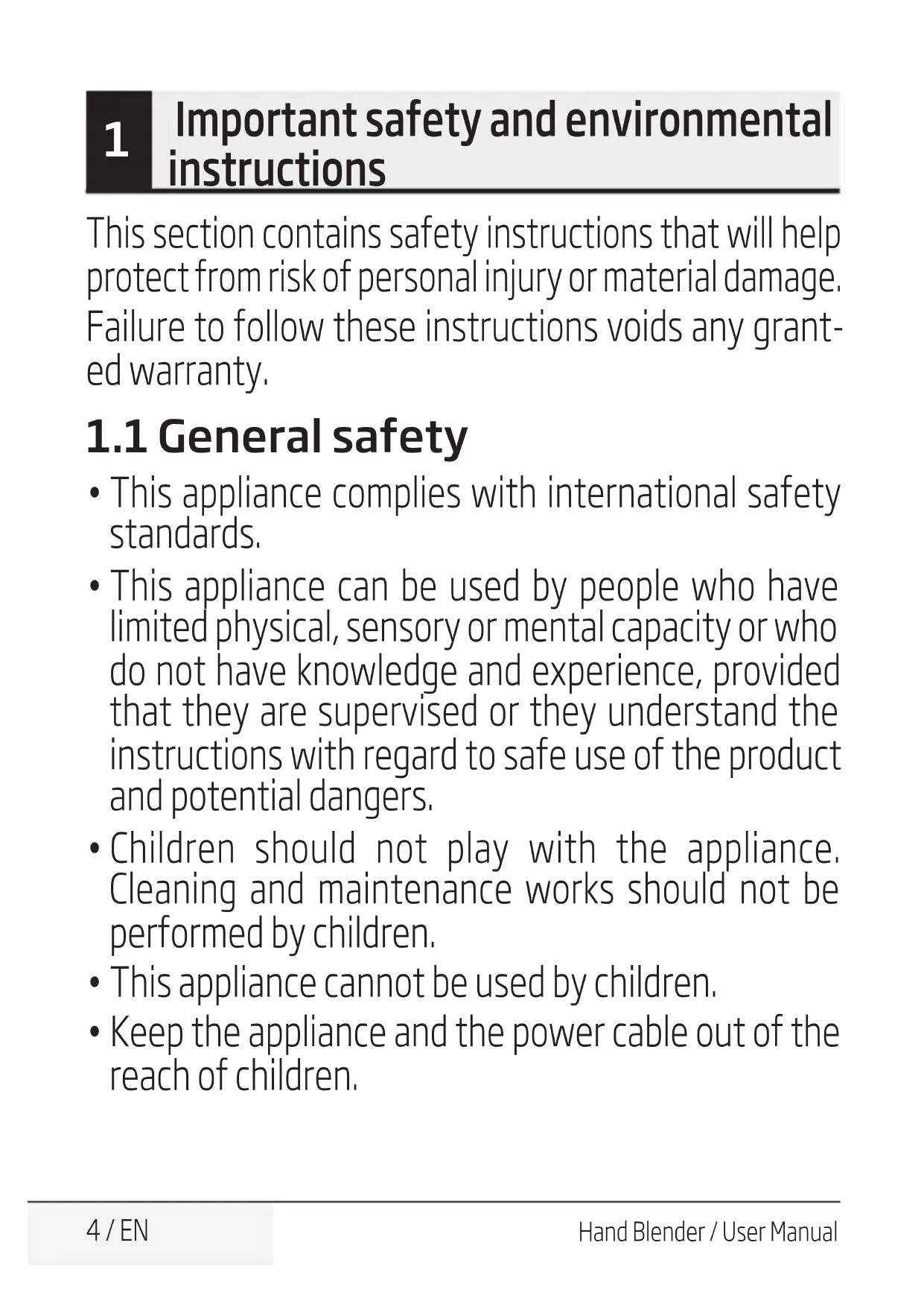 - Keep the appliance and the power cable out of the reach of children.5 / EN Hand Blender / User Manual