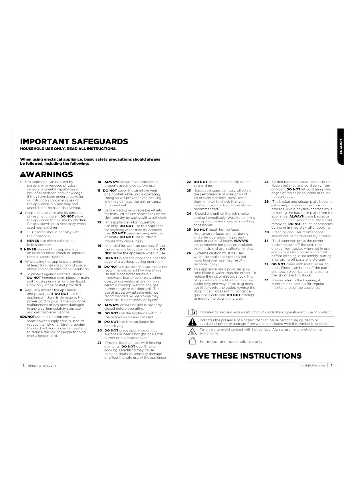 Before placing removable basket into the main unit, ensure basket and unit are clean and dry by wiping with a soft cloth. 13 This appliance is for household use only. DO NOT use this appliance for anything other than its intended use. DO NOT use in moving vehicles or boats. DO NOT use outdoors. Misuse may cause injury. 14 Intended for worktop use only. Ensure the surface is level, clean and dry. DO NOT move the appliance when in use. 15 DO NOT place the appliance near the edge of a worktop during operation. 16 DO NOT use accessory attachments not recommended or sold by SharkNinja. Do not place accessories in a microwave, toaster oven, convection oven, or conventional oven or on a ceramic cooktop, electric coil, gas burner range or outdoor grill. The use of accessory attachments not recommended by SharkNinja may cause fire, electric shock or injuries. 17 ALWAYS ensure basket is properly closed before operating. 18 DO NOT use the appliance without the removable basket installed. 19 DO NOT use this appliance for deep-frying. 20 DO NOT place appliance on hot surfaces or near a hot gas or electric burner or in a heated oven. 21 Prevent food contact with heating elements. DO NOT overfill when cooking. Overfilling may cause personal injury or property damage or affect the safe use of the appliance. 22 DO NOT place items on top of unit at any time. 23 Socket voltages can vary, affecting the performance of your product. To prevent possible illness, use a thermometer to check that your food is cooked to the temperatures recommended. 24 Should the unit emit black smoke, unplug immediately. Wait for smoking to stop before removing any cooking accessories. 25 DO NOT touch hot surfaces. Appliance surfaces are hot during and after operation. To prevent burns or personal injury, ALWAYS use protective hot pads or insulated oven mitts and use available handles. 26 Extreme caution must be used when the appliance contains hot food. Improper use may result in personal injury. 27 This appliance has a polarized plug (one blade is wider than the other). To reduce the risk of electric shock, this plug is intended to fit into a polarized outlet only one way. If the plug does not fit fully into the outlet, reverse the plug. If it still does not fit, contact a qualified electrician. DO NOT attempt to modify the plug in any way. 28 Spilled food can cause serious burns. Keep appliance and cord away from children. DO NOT let cord hang over edges of tables or counters or touch hot surfaces. 29 The basket and crisper plate become extremely hot during the cooking process. Avoid physical contact while removing the basket or plate from the appliance. ALWAYS place basket or plate on a heat-resistant surface after removing. DO NOT touch accessories during or immediately after cooking. 30 Cleaning and user maintenance should not be carried out by children. 31 To disconnect, press the power button to turn off the unit, then unplug from socket when not in use and before cleaning. Allow to cool before cleaning, disassembly, putting in or taking off parts and storage. 32 DO NOT clean with metal scouring pads. Pieces can break off the pad and touch electrical parts, creating the risk of electric shock. 33 Please refer to the Cleaning & Maintenance section for regular maintenance of the appliance.