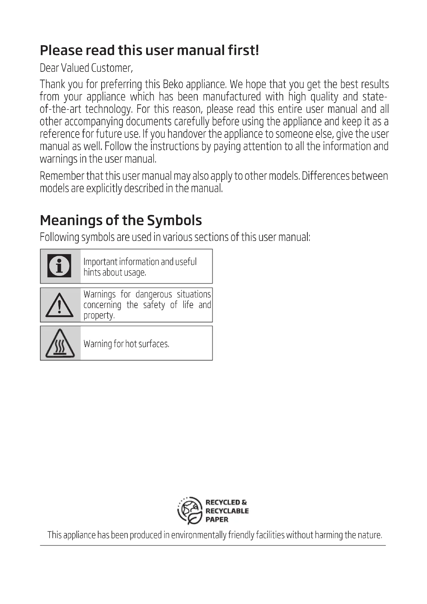 TÜRKÇE 319-339Please read this user manual first! Dear Valued Customer, Thank you for preferring this Beko appliance. We hope that you get the best results from your appliance which has been manufactured with high quality and state- of-the-art technology. For this reason, please read this entire user manual and all other accompanying documents carefully before using the appliance and keep it as a reference for future use. If you handover the appliance to someone else, give the user manual as well. Follow the instructions by paying attention to all the information and warnings in the user manual. Remember that this user manual may also apply to other models. Differences between models are explicitly described in the manual. Meanings of the Symbols Following symbols are used in various sections of this user manual: