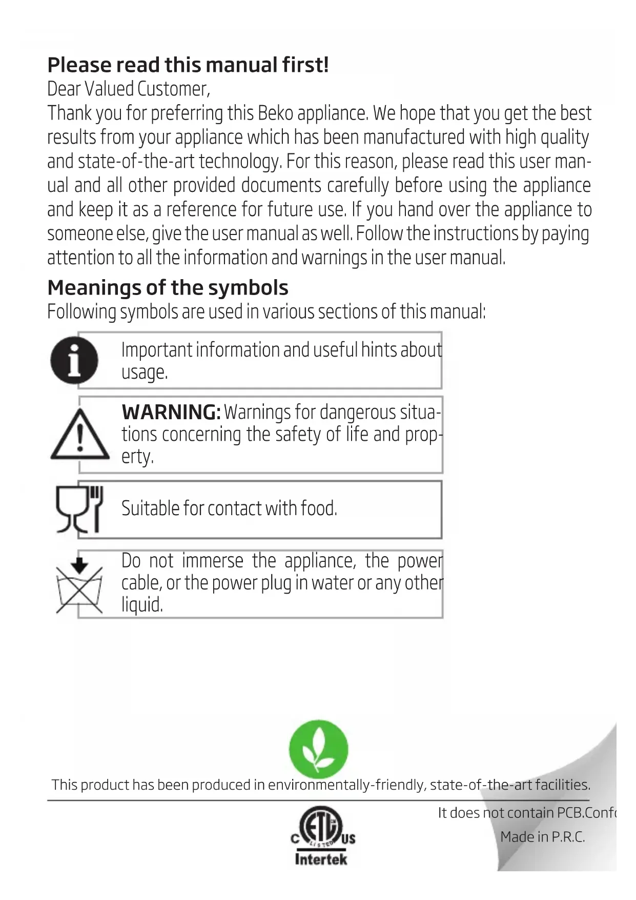 Warnings for dangerous situa- tions concerning the safety of life and prop- erty. Suitable for contact with food. Do not immerse the appliance, the power cable, or the power plug in water or any other liquid. This product has been produced in environmentally-friendly, state-of-the-art facilities. It does not contain PCB.Conforms to the WEEE Directive. Made in P.R.C.The values which are declared in the markings affixed on your appliance or the other printed documents supplied with it repre- sent the values which were obtained in the laboratories pursuant to the pertinent standards. These values may vary according to the usage of the appliance and ambient conditions.
