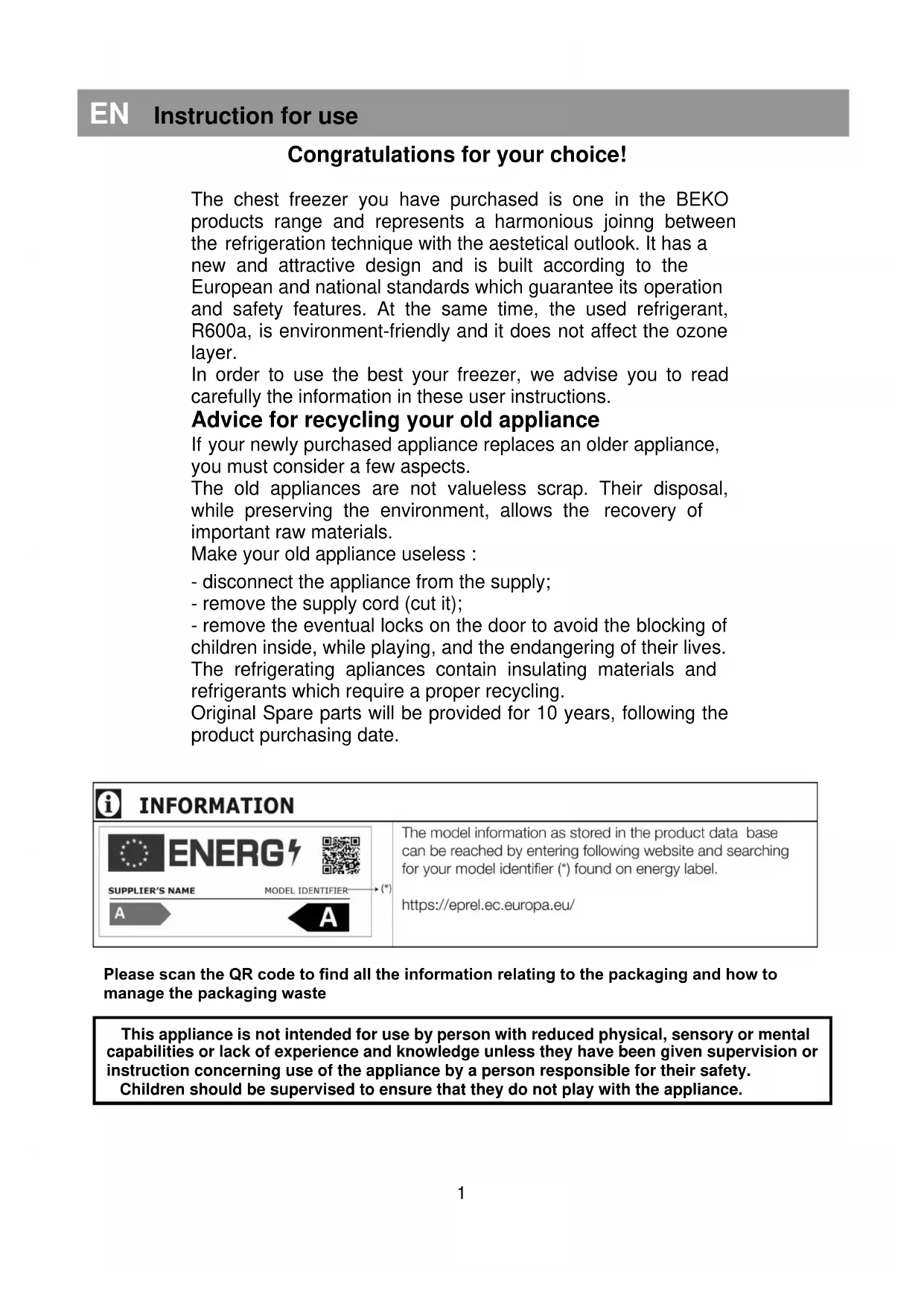 5Congratulations for your choice! The chest freezer you have purchased is one in the BEKO products range and represents a harmonious joinng between the refrigeration technique with the aestetical outlook. It has a new and attractive design and is built according to the European and national standards which guarantee its operation and safety features. At the same time, the used refrigerant, R600a, is environment-friendly and it does not affect the ozone layer. In order to use the best your freezer, we advise you to read carefully the information in these user instructions. Advice for recycling your old appliance If your newly purchased appliance replaces an older appliance, you must consider a few aspects. The old appliances are not valueless scrap. Their disposal, while preserving the environment, allows the recovery of important raw materials. Make your old appliance useless : - disconnect the appliance from the supply; - remove the supply cord (cut it); - remove the eventual locks on the door to avoid the blocking of children inside, while playing, and the endangering of their lives. The refrigerating apliances contain insulating materials and refrigerants which require a proper recycling. Original Spare parts will be provided for 10 years, following the product purchasing date.