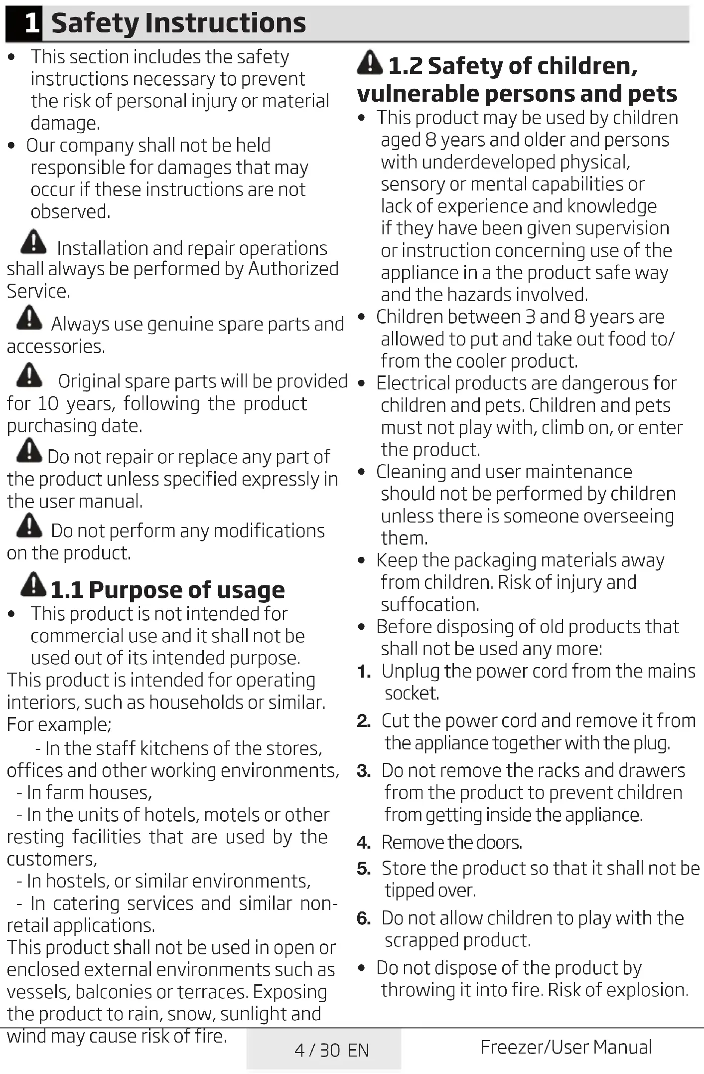 - Do not dispose of the product by throwing it into fire. Risk of explosion.5 / 30 EN Freezer/User Manual Safety instructions