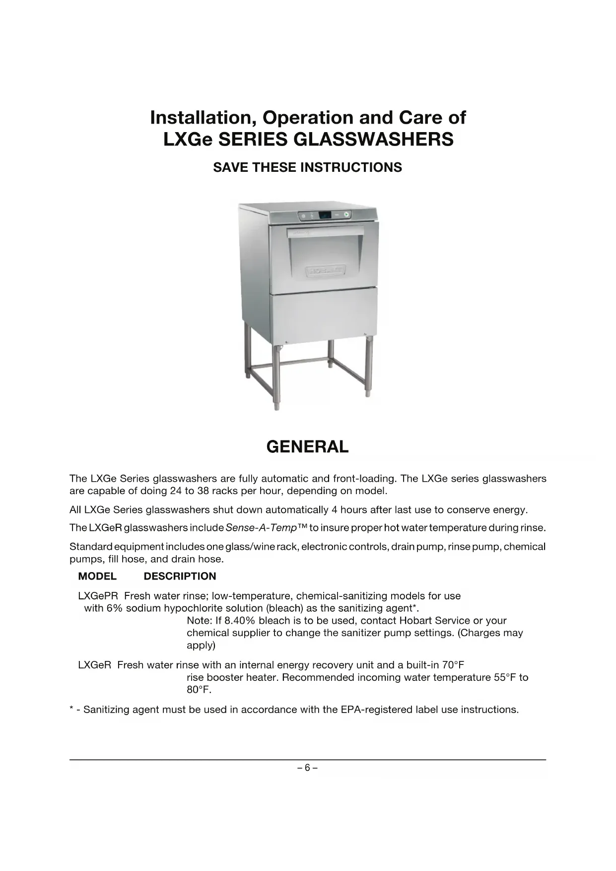 GENERAL The LXGe Series glasswashers are fully automatic and front-loading. The LXGe series glasswashers are capable of doing 24 to 38 racks per hour, depending on model. All LXGe Series glasswashers shut down automatically 4 hours after last use to conserve energy. The LXGeR glasswashers include Sense-A-Temp™ to insure proper hot water temperature during rinse. Standard equipment includes one glass/wine rack, electronic controls, drain pump, rinse pump, chemical pumps, ll hose, and drain hose. MODEL DESCRIPTION LXGePR Fresh water rinse; low-temperature, chemical-sanitizing models for use with 6% sodium hypochlorite solution (bleach) as the sanitizing agent*. Note: If 8.40% bleach is to be used, contact Hobart Service or your chemical supplier to change the sanitizer pump settings. (Charges may apply) LXGeR Fresh water rinse with an internal energy recovery unit and a built-in 70°F rise booster heater. Recommended incoming water temperature 55°F to 80°F.