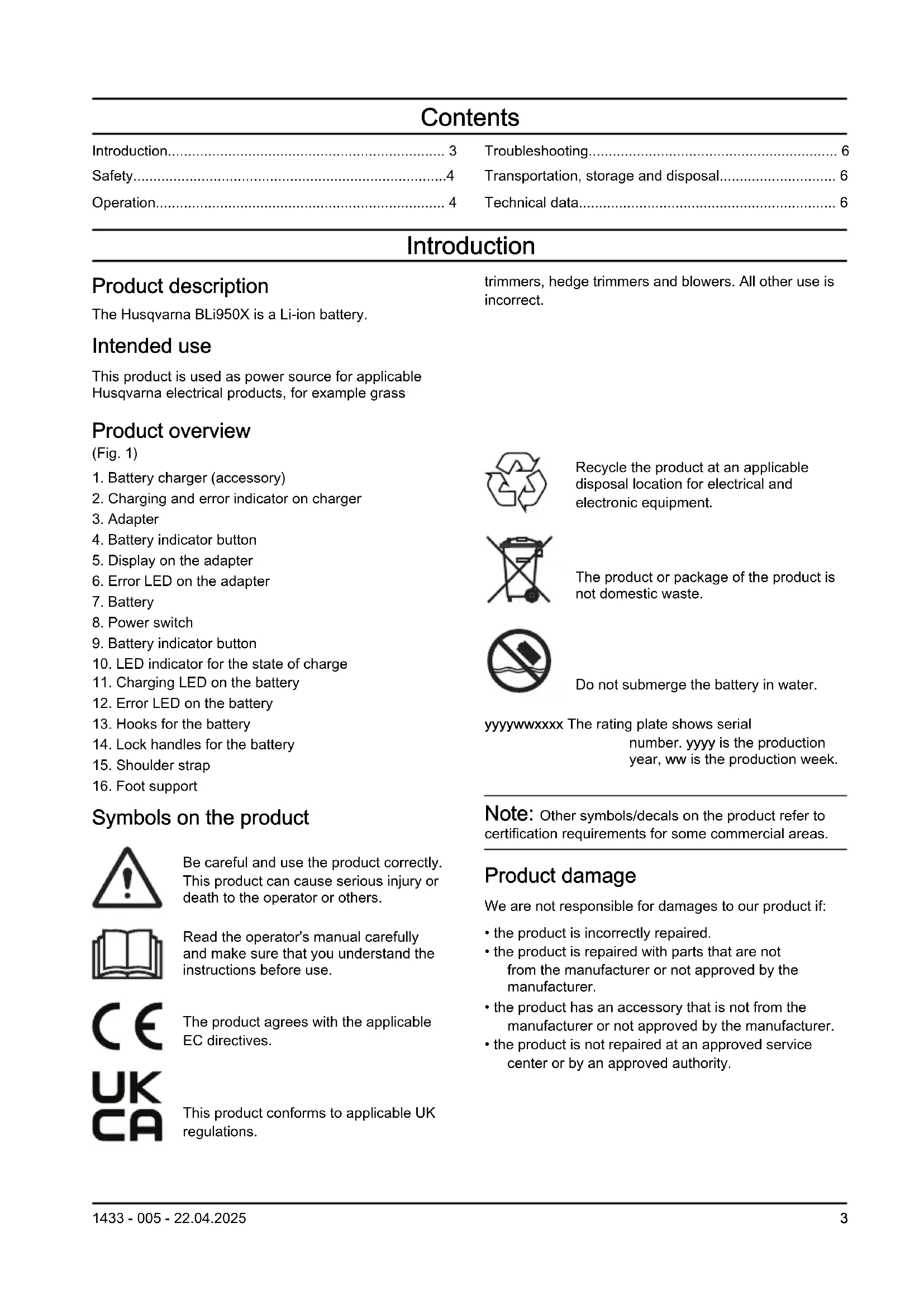 Symbols on the product Be careful and use the product correctly. This product can cause serious injury or death to the operator or others. Read the operator's manual carefully and make sure that you understand the instructions before use. The product agrees with the applicable EC directives. This product conforms to applicable UK regulations. Recycle the product at an applicable disposal location for electrical and electronic equipment. The product or package of the product is not domestic waste. Do not submerge the battery in water. yyyywwxxxx The rating plate shows serial number. yyyy is the production year, ww is the production week. Note: Other symbols/decals on the product refer to certification requirements for some commercial areas. Product damage We are not responsible for damages to our product if: