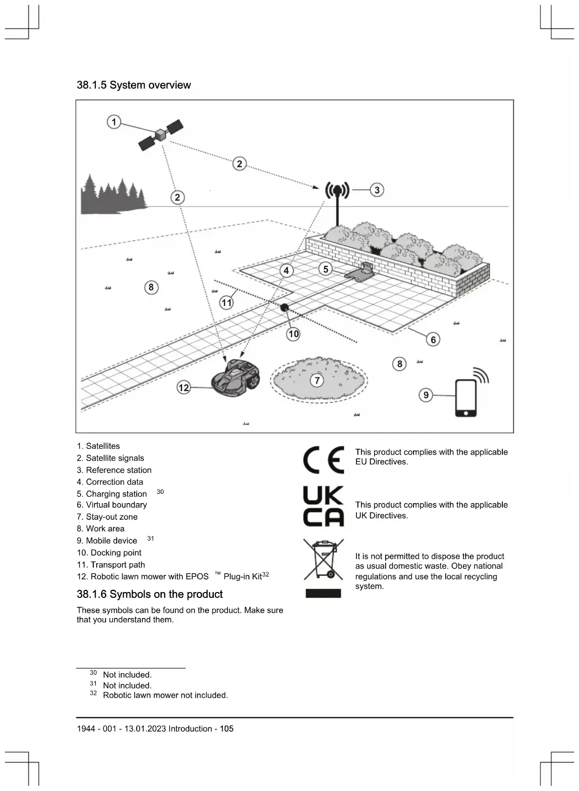 Robotic lawn mower not included. 1944 - 001 - 13.01.2023 Introduction - 105Use a detachable power sup- ply as specified on the rating plate adjacent to the symbol. The chassis contains components which are sensitive to electrostatic discharge (ESD). The chassis must only be opened and sealed by an authorized service technician. The warranty will not be applicable if the seal is broken. Note: Other symbols/decals on the product refer to certification requirements for some markets.