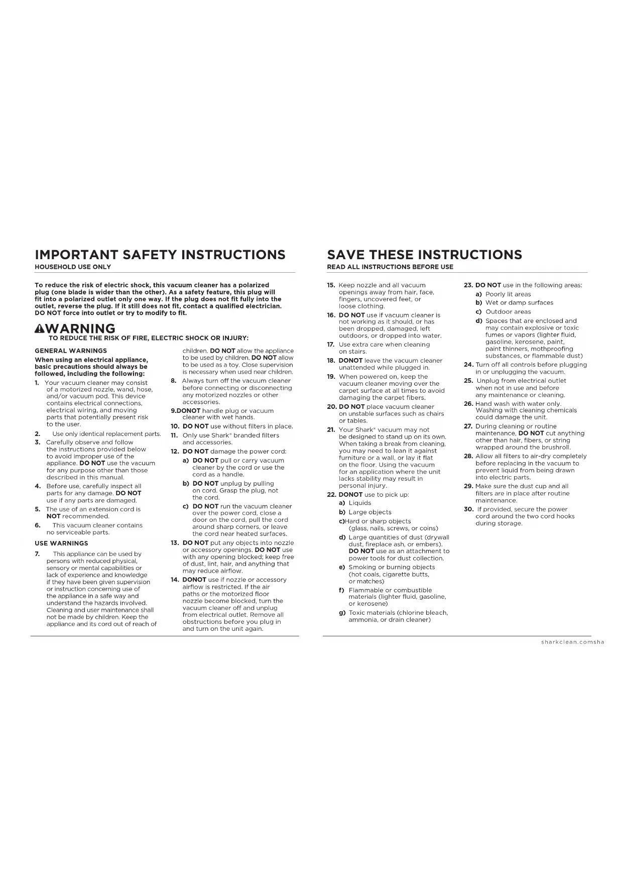 How to get service If your appliance fails to operate properly while in use under normal household conditions within the warranty period, visit sharkclean.com for product care and maintenance self-help. Our Customer Service Specialists are also available at 1-800-798-7398 to assist with product support and warranty service options, including the possibility of upgrading to our VIP warranty service options for select product categories. SharkNinja will cover the cost for the customer to send in the unit to us for repair or replacement. A fee of $24.95 (subject to change) will be charged when SharkNinja ships the repaired or replacement unit. How to initiate a warranty claim You must call 1-800-798-7398 to initiate a warranty claim. You will need the receipt as proof of purchase. A Customer Service Specialist will provide you with return and packing instruction information. How state law applies This warranty gives you specific legal rights, and you also may have other rights that vary from state to state. Some states do not permit the exclusion or limitation of incidental or consequential damages, so the above may not apply to you. FIVE (5) YEAR LIMITED WARRANTYsharkclean.comsharkclean.com NOTES TECHNICAL SPECIFICATIONS Voltage: 120V, 60Hz Watts: 500W Amps: 4.2A