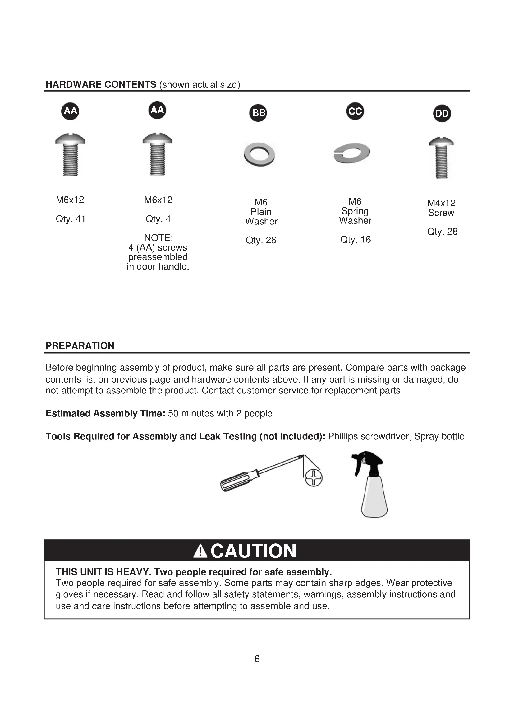 Plain Washer Qty. 26 PREPARATION Before beginning assembly of product, make sure all parts are present. Compare parts with package contents list on previous page and hardware contents above. If any part is missing or damaged, do not attempt to assemble the product. Contact customer service for replacement parts. Estimated Assembly Time: 50 minutes with 2 people. Tools Required for Assembly and Leak Testing (not included): Phillips screwdriver, Spray bottle CAUTION THIS UNIT IS HEAVY. Two people required for safe assembly. Two people required for safe assembly. Some parts may contain sharp edges. Wear protective gloves if necessary. Read and follow all safety statements, warnings, assembly instructions and use and care instructions before attempting to assemble and use.