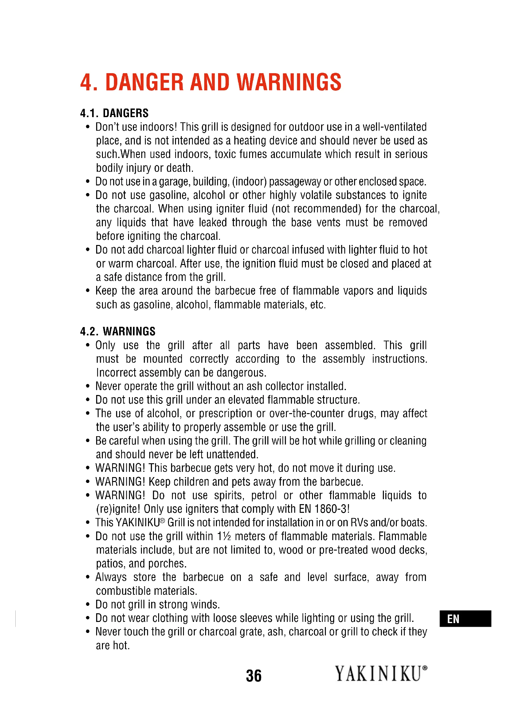 - Keep the area around the barbecue free of ammable vapors and liquids such as gasoline, alcohol, ammable materials, etc. 4.2. WARNINGS