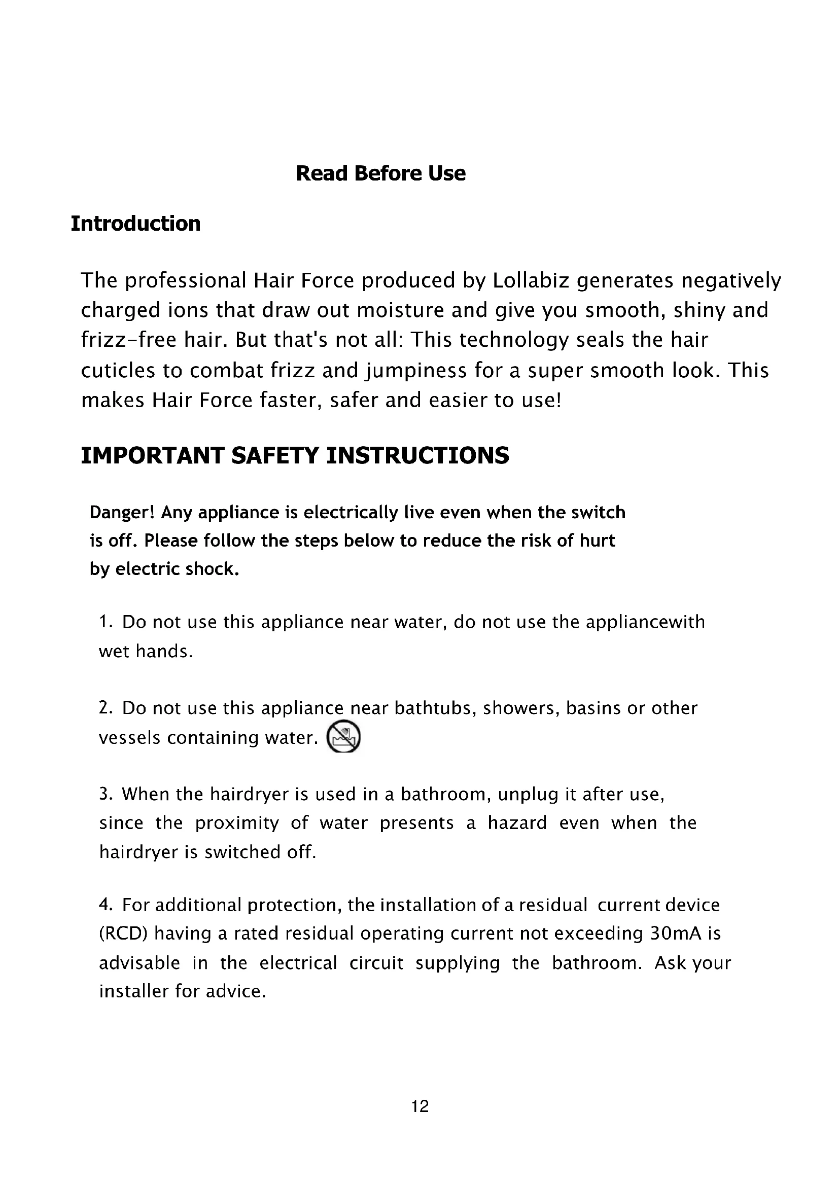 Read Before Use Introduction The professional Hair Force produced by Lollabiz generates negatively charged ions that draw out moisture and give you smooth, shiny and frizz-free hair. But that's not all: This technology seals the hair cuticles to combat frizz and jumpiness for a super smooth look. This makes Hair Force faster, safer and easier to use!