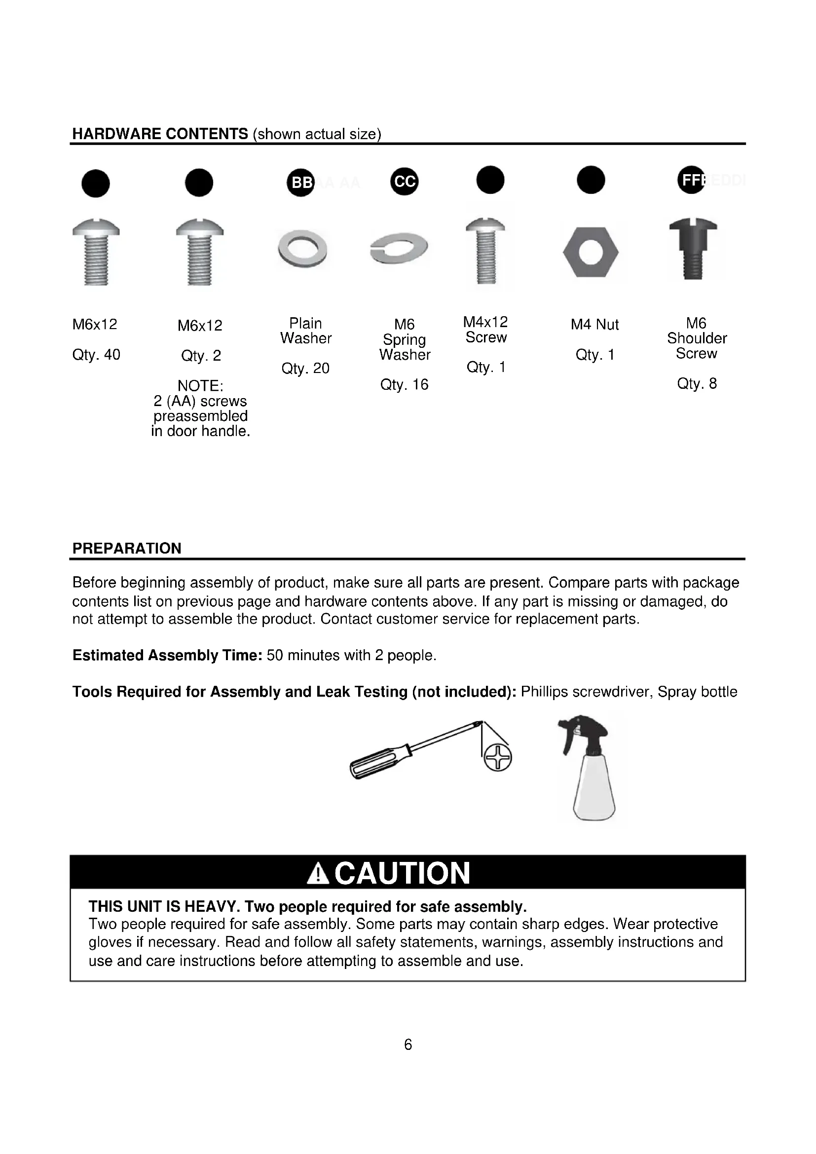 Spring Washer Qty. 16 M6x12 Qty. 2 NOTE: 2 (AA) screws preassembled in door handle. Plain Washer Qty. 20 PREPARATION Before beginning assembly of product, make sure all parts are present. Compare parts with package contents list on previous page and hardware contents above. If any part is missing or damaged, do not attempt to assemble the product. Contact customer service for replacement parts. Estimated Assembly Time: 50 minutes with 2 people. Tools Required for Assembly and Leak Testing (not included): Phillips screwdriver, Spray bottle CAUTION THIS UNIT IS HEAVY. Two people required for safe assembly. Two people required for safe assembly. Some parts may contain sharp edges. Wear protective gloves if necessary. Read and follow all safety statements, warnings, assembly instructions and use and care instructions before attempting to assemble and use. BBAA AA