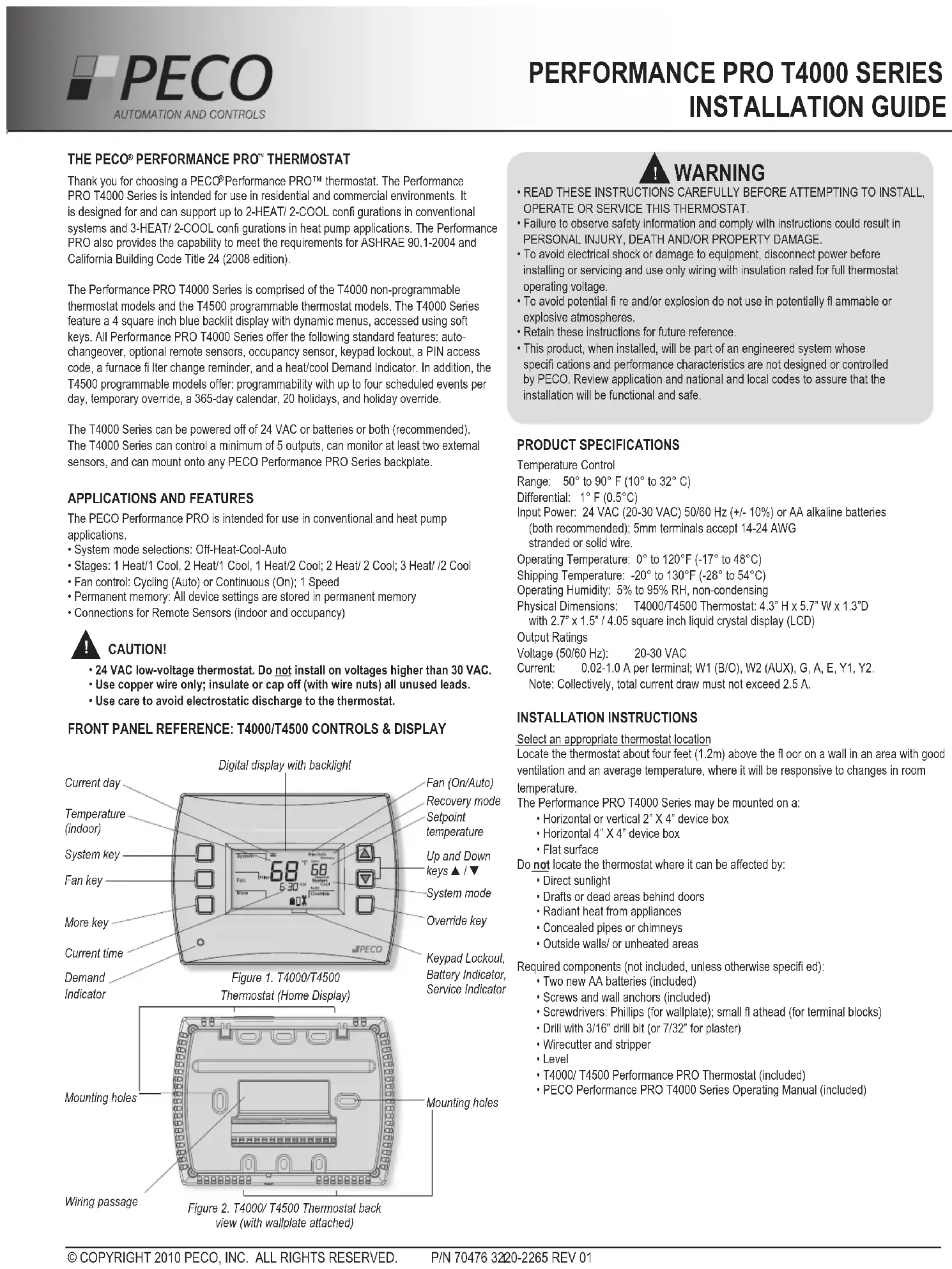 Thank you for choosing a PECO Performance PRO™ thermostat. The Performance PRO T4000 Series is intended for use in residential and commercial environments. It is designed for and can support up to 2-HEAT/ 2-COOL con gurations in conventional systems and 3-HEAT/ 2-COOL con gurations in heat pump applications. The Performance PRO also provides the capability to meet the requirements for ASHRAE 90.1-2004 and California Building Code Title 24 (2008 edition). The Performance PRO T4000 Series is comprised of the T4000 non-programmable thermostat models and the T4500 programmable thermostat models. The T4000 Series feature a 4 square inch blue backlit display with dynamic menus, accessed using soft keys. All Performance PRO T4000 Series offer the following standard features: auto-changeover, optional remote sensors, occupancy sensor, keypad lockout, a PIN access code, a furnace lter change reminder, and a heat/cool Demand Indicator. In addition, the T4500 programmable models offer: programmability with up to four scheduled events per day, temporary override, a 365-day calendar, 20 holidays, and holiday override. The T4000 Series can be powered off of 24 VAC or batteries or both (recommended). The T4000 Series can control a minimum of 5 outputs, can monitor at least two external sensors, and can mount onto any PECO Performance PRO Series backplate.The PECO Performance PRO is intended for use in conventional and heat pump applications. • System mode selections: Off-Heat-Cool-Auto• Stages: 1 Heat/1 Cool, 2 Heat/1 Cool, 1 Heat/2 Cool; 2 Heat/ 2 Cool; 3 Heat/ /2 Cool• Fan control: Cycling (Auto) or Continuous (On); 1 Speed • Permanent memory: All device settings are stored in permanent memory • Connections for Remote Sensors (indoor and occupancy) • • • Temperature Control Range: 50° to 90° F (10° to 32° C) Differential: 1° F (0.5°C)Input Power: 24 VAC (20-30 VAC) 50/60 Hz (+/- 10%) or AA alkaline batteries (both recommended); 5mm terminals accept 14-24 AWG stranded or solid wire.Operating Temperature: 0° to 120°F (-17° to 48°C)Shipping Temperature: -20° to 130°F (-28° to 54°C)Operating Humidity: 5% to 95% RH, non-condensing Physical Dimensions: T4000/T4500 Thermostat: 4.3” H x 5.7” W x 1.3”D with 2.7” x 1.5” / 4.05 square inch liquid crystal display (LCD)Output RatingsVoltage (50/60 Hz): 20-30 VACCurrent: 0.02-1.0 A per terminal; W1 (B/O), W2 (AUX), G, A, E, Y1, Y2. Note: Collectively, total current draw must not exceed 2.5 A.Select an appropriate thermostat locationLocate the thermostat about four feet (1.2m) above the oor on a wall in an area with good ventilation and an average temperature, where it will be responsive to changes in room temperature. The Performance PRO T4000 Series may be mounted on a: • Horizontal or vertical 2” X 4” device box • Horizontal 4” X 4” device box • Flat surface Do locate the thermostat where it can be affected by: • Direct sunlight• Drafts or dead areas behind doors• Radiant heat from appliances• Concealed pipes or chimneys• Outside walls/ or unheated areas Required components (not included, unless otherwise speci ed):• Two new AA batteries (included)• Screws and wall anchors (included)• Screwdrivers: Phillips (for wallplate); small athead (for terminal blocks)• Drill with 3/16” drill bit (or 7/32” for plaster)• Wirecutter and stripper• Level• T4000/ T4500 Performance PRO Thermostat (included)• PECO Performance PRO T4000 Series Operating Manual (included)