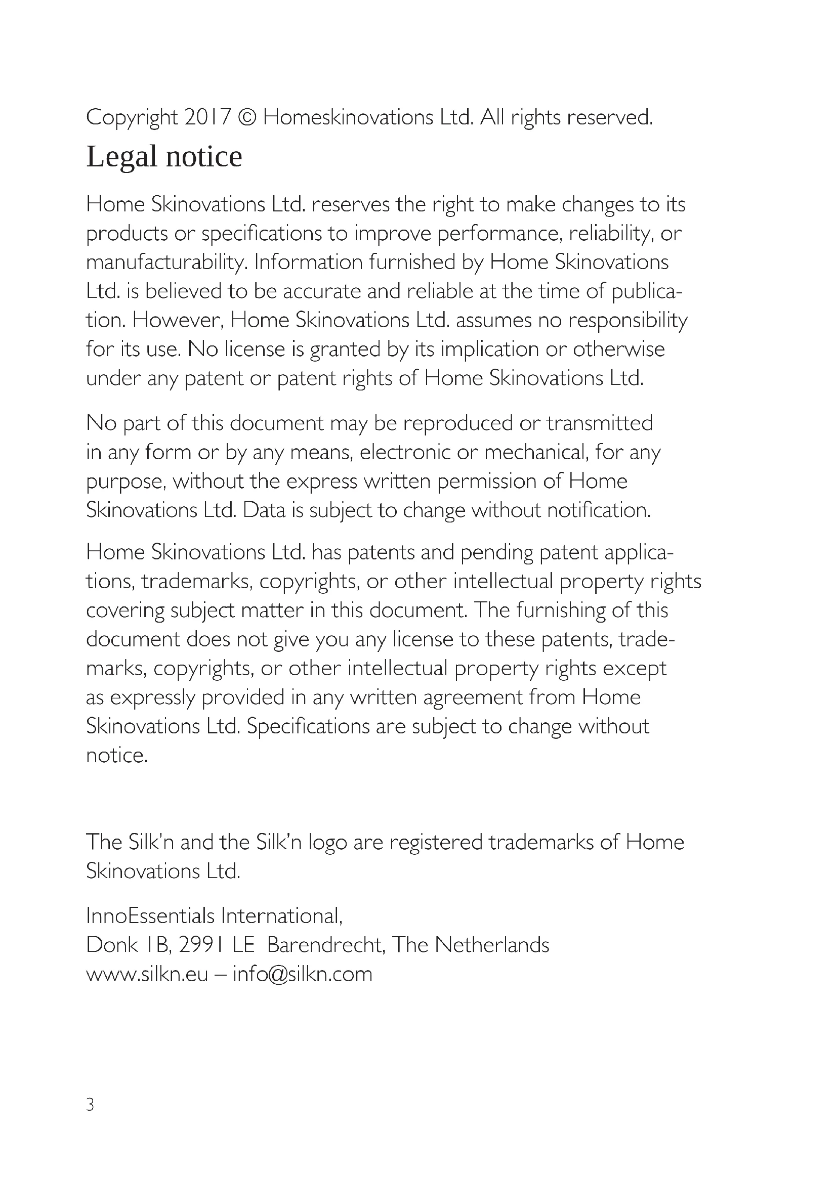 Copyright 2017 © Homeskinovations Ltd. All rights reserved. Legal notice Home Skinovations Ltd. reserves the right to make changes to its products or specifications to improve performance, reliability, or manufacturability. Information furnished by Home Skinovations Ltd. is believed to be accurate and reliable at the time of publica- tion. However, Home Skinovations Ltd. assumes no responsibility for its use. No license is granted by its implication or otherwise under any patent or patent rights of Home Skinovations Ltd. No part of this document may be reproduced or transmitted in any form or by any means, electronic or mechanical, for any purpose, without the express written permission of Home Skinovations Ltd. Data is subject to change without notification. Home Skinovations Ltd. has patents and pending patent applica- tions, trademarks, copyrights, or other intellectual property rights covering subject matter in this document. The furnishing of this document does not give you any license to these patents, trade- marks, copyrights, or other intellectual property rights except as expressly provided in any written agreement from Home Skinovations Ltd. Specifications are subject to change without notice. The Silk’n and the Silk’n logo are registered trademarks of Home Skinovations Ltd. InnoEssentials International, Donk 1B, 2991 LE Barendrecht, The Netherlands www.silkn.eu – info@silkn.com4