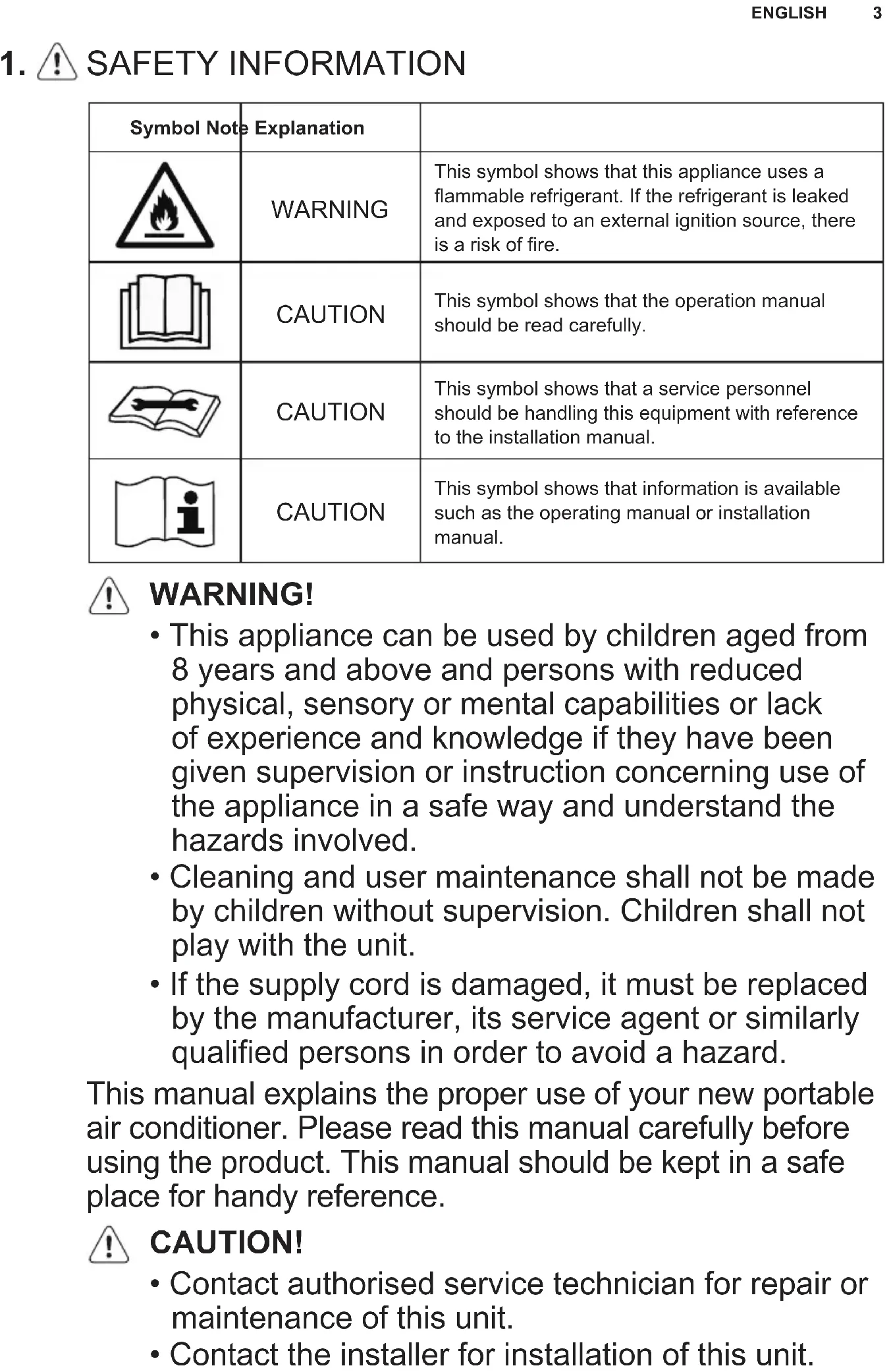 - If the supply cord is damaged, it must be replaced by the manufacturer, its service agent or similarly qualifiedpersonsinordertoavoidahazard. This manual explains the proper use of your new portable air conditioner. Please read this manual carefully before using the product. This manual should be kept in a safe place for handy reference. CAUTION!