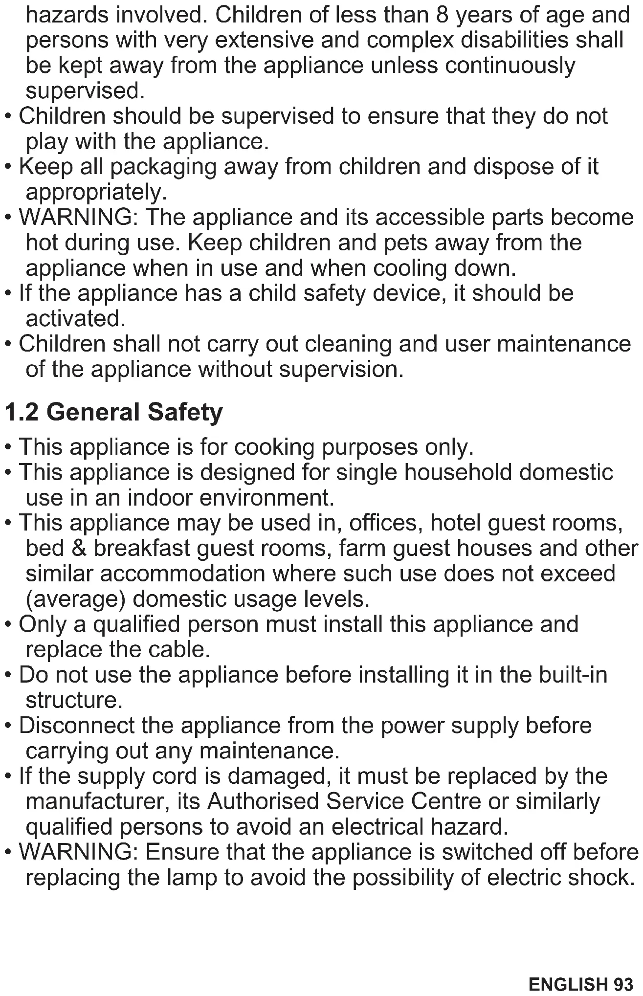 - WARNING: Ensure that the appliance is switched off before replacing the lamp to avoid the possibility of electric shock. ENGLISH 93• WARNING: The appliance and its accessible parts become hot during use. Care should be taken to avoid touching heating elements or the surface of the appliance cavity.