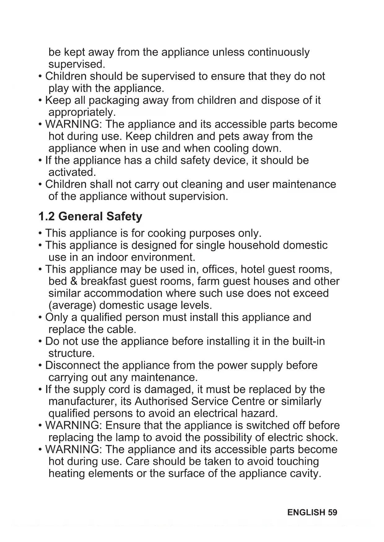 - WARNING: The appliance and its accessible parts become hot during use. Care should be taken to avoid touching heating elements or the surface of the appliance cavity. ENGLISH 59• Always use oven gloves to remove or insert accessories or ovenware.