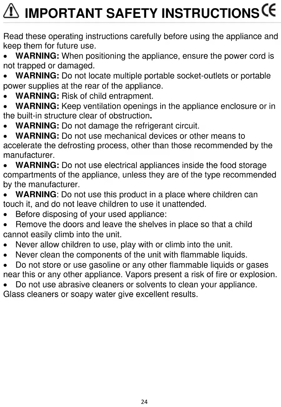 - WARNING: Do not use mechanical devices or other means to accelerate the defrosting process, other than those recommended by the manufacturer.