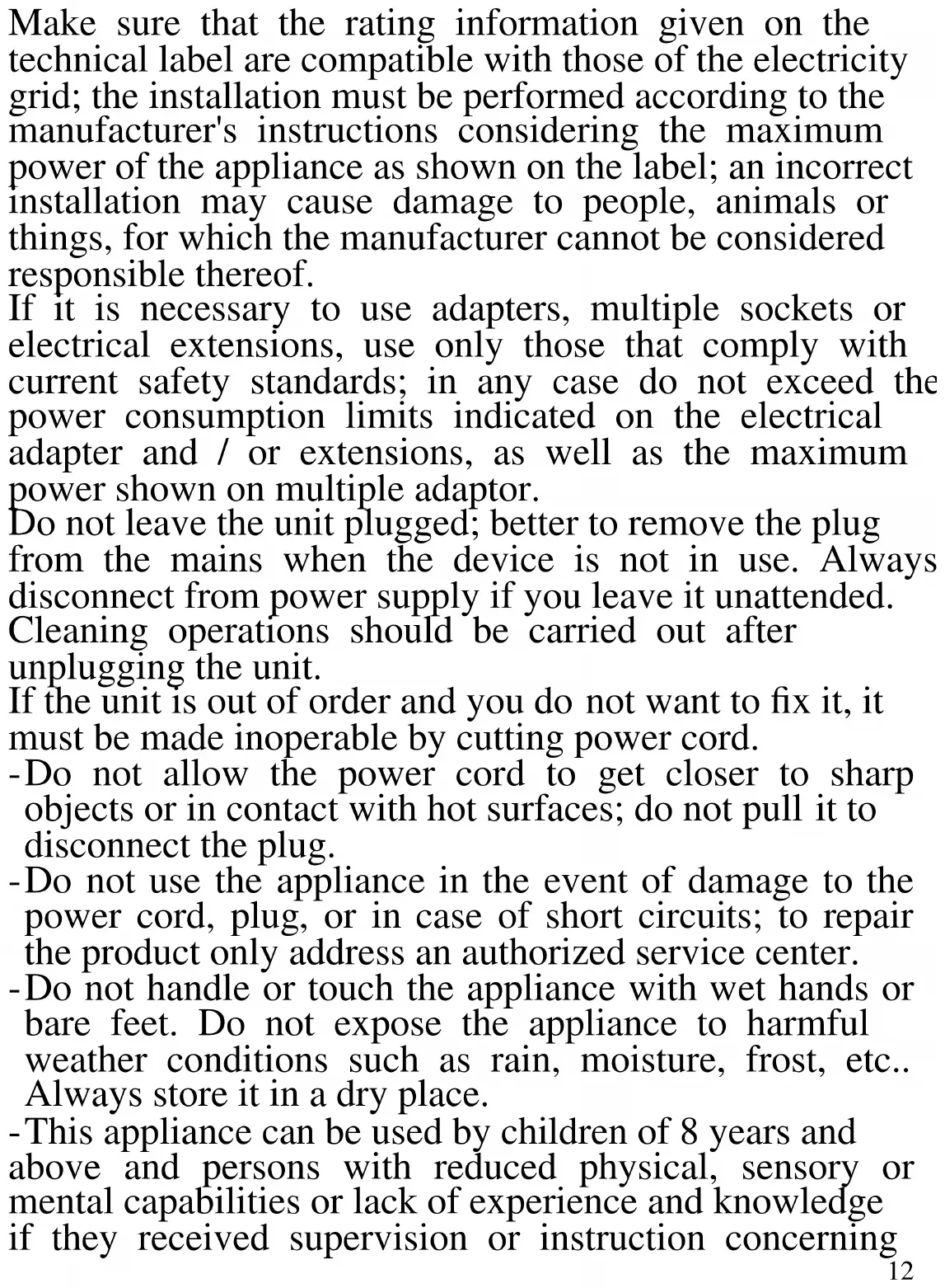 The following are important notes on the installation, use and maintenance; save this instruction manual for future reference; use the equipment only as specified in this guide; any other use is considered improper and dangerous; therefore, the manufacturer cannot be held responsible in the event of damages caused by improper, incorrect or unreasonable use. Before use, ensure the equipment is undamaged; if in doubt, do not attempt to use it and contact the authorized service center; do not leave packing materials (i.e. plastic bags, polystyrene foam, nails, staples, etc.) within the reach of children as they are potential sources of danger; always remember that they must be separately collected.12 Make sure that the rating information given on the technical label are compatible with those of the electricity grid; the installation must be performed according to the manufacturer's instructions considering the maximum power of the appliance as shown on the label; an incorrect installation may cause damage to people, animals or things, for which the manufacturer cannot be considered responsible thereof. If it is necessary to use adapters, multiple sockets or electrical extensions, use only those that comply with current safety standards; in any case do not exceed the power consumption limits indicated on the electrical adapter and / or extensions, as well as the maximum power shown on multiple adaptor. Do not leave the unit plugged; better to remove the plug from the mains when the device is not in use. Always disconnect from power supply if you leave it unattended. Cleaning operations should be carried out after unplugging the unit. If the unit is out of order and you do not want to fix it, it must be made inoperable by cutting power cord. - Do not allow the power cord to get closer to sharp objects or in contact with hot surfaces; do not pull it to disconnect the plug. - Do not use the appliance in the event of damage to the power cord, plug, or in case of short circuits; to repair the product only address an authorized service center. - Do not handle or touch the appliance with wet hands or bare feet. Do not expose the appliance to harmful weather conditions such as rain, moisture, frost, etc.. Always store it in a dry place. - This appliance can be used by children of 8 years and above and persons with reduced physical, sensory or mental capabilities or lack of experience and knowledge if they received supervision or instruction concerning13 use of the appliance in a safe way and understand hazards involved; children shall not play with the appliance; cleaning and user maintenance shall not be made by children without supervision. - Children must not play with the appliance. - Keep the appliance and its cord out of reach of children less than 8 years. If the power cord is damaged, or in case of failure and / or malfunction do not tamper with the unit. The reparation must be done by manufacturer or by service center authorized by the manufacturer in order to prevent any risk. Failure to comply with the above may compromise the unit safety and invalidate the warranty.