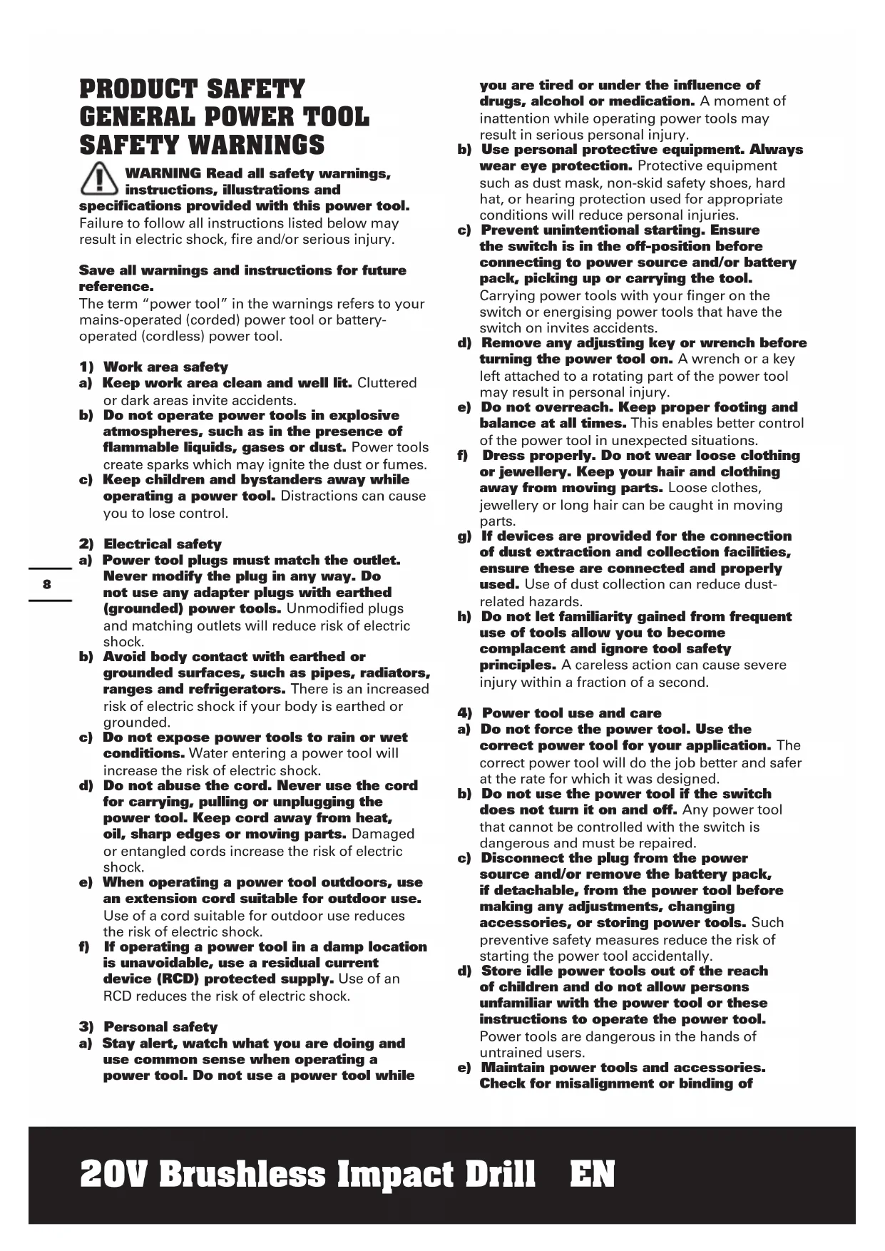 a) Do not force the power tool. Use the correct power tool for your application. The correct power tool will do the job better and safer at the rate for which it was designed. b) Do not use the power tool if the switch does not turn it on and off. Any power tool that cannot be controlled with the switch is dangerous and must be repaired. c) Disconnect the plug from the power source and/or remove the battery pack, if detachable, from the power tool before making any adjustments, changing accessories, or storing power tools. Such preventive safety measures reduce the risk of starting the power tool accidentally. d) Store idle power tools out of the reach of children and do not allow persons unfamiliar with the power tool or these instructions to operate the power tool. Power tools are dangerous in the hands of untrained users. e) Maintain power tools and accessories. Check for misalignment or binding of9 20V Brushless Impact Drill EN moving parts, breakage of parts and any other condition that may affect the power tool’s operation. If damaged, have the power tool repaired before use. Many accidents are caused by poorly maintained power tools. f) Keep cutting tools sharp and clean. Properly maintained cutting tools with sharp cutting edges are less likely to bind and are easier to control. g) Use the power tool, accessories and tool bits etc. in accordance with these instructions, taking into account the working conditions and the work to be performed. Use of the power tool for operations different from those intended could result in a hazardous situation. h) Keep handles and grasping surfaces dry, clean and free from oil and grease. Slippery handles and grasping surfaces do not allow for safe handling and control of the tool in unexpected situations.