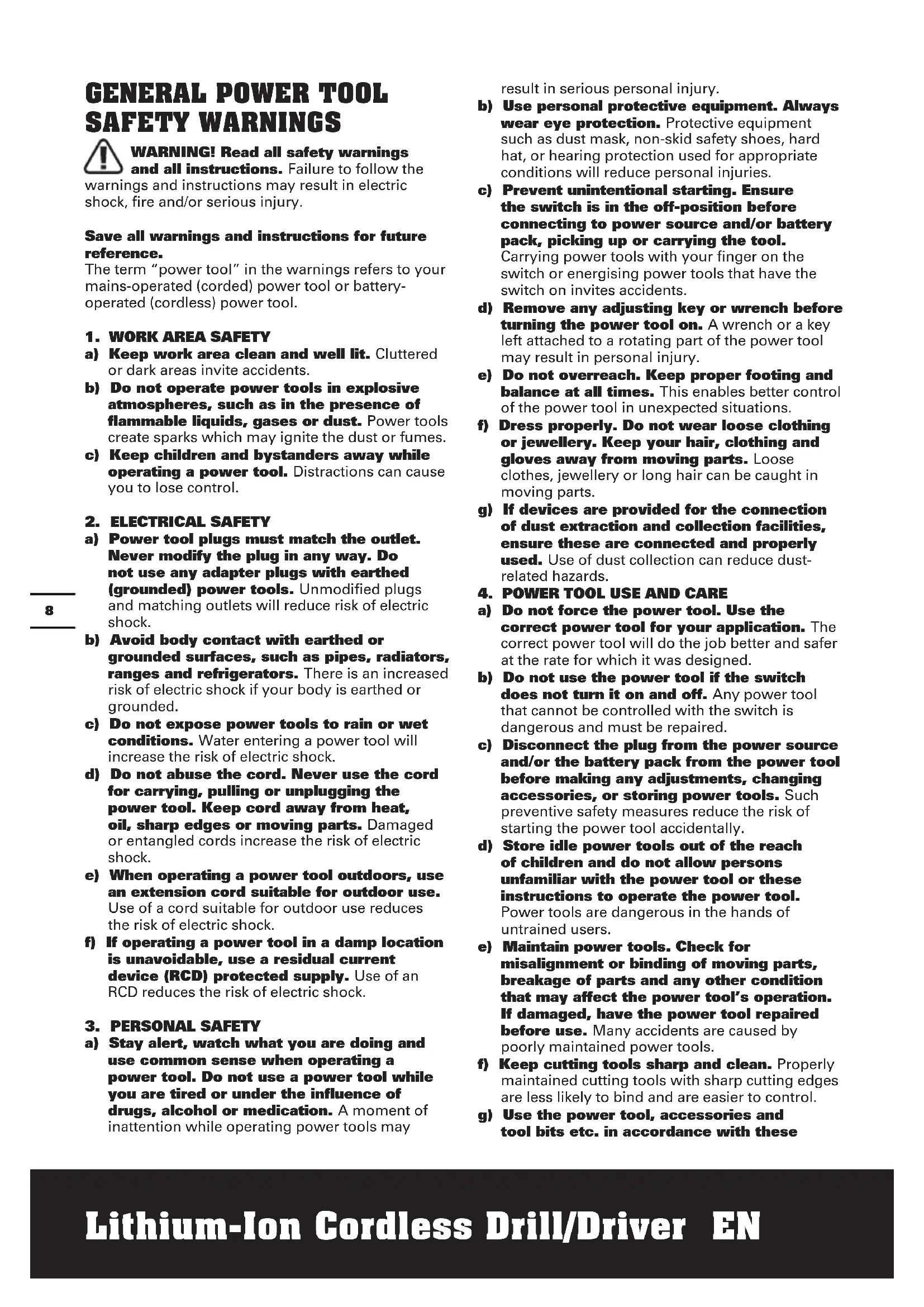 a) Do not force the power tool. Use the correct power tool for your application. The correct power tool will do the job better and safer at the rate for which it was designed. b) Do not use the power tool if the switch does not turn it on and off. Any power tool that cannot be controlled with the switch is dangerous and must be repaired. c) Disconnect the plug from the power source and/or the battery pack from the power tool before making any adjustments, changing accessories, or storing power tools. Such preventive safety measures reduce the risk of starting the power tool accidentally. d) Store idle power tools out of the reach of children and do not allow persons unfamiliar with the power tool or these instructions to operate the power tool. Power tools are dangerous in the hands of untrained users. e) Maintain power tools. Check for misalignment or binding of moving parts, breakage of parts and any other condition that may affect the power tool’s operation. If damaged, have the power tool repaired before use. Many accidents are caused by poorly maintained power tools. f) Keep cutting tools sharp and clean. Properly maintained cutting tools with sharp cutting edges are less likely to bind and are easier to control. g) Use the power tool, accessories and tool bits etc. in accordance with these9 Lithium-Ion Cordless Drill/Driver EN instructions, taking into account the working conditions and the work to be performed. Use of the power tool for operations different from those intended could result in a hazardous situation.